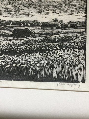 Knud Hansen (født 1934): Køer på mark 1976. Træsnit på papir. Sign.: Knud Hansen - 76. Eget tryk. 30x19 (43x31)