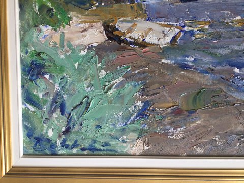 Børge Bokkenheuser (1910-76): Kystparti med båd på strand. Olie på lærred. Sign.: Bokkenheuser 51x61 (69x79)