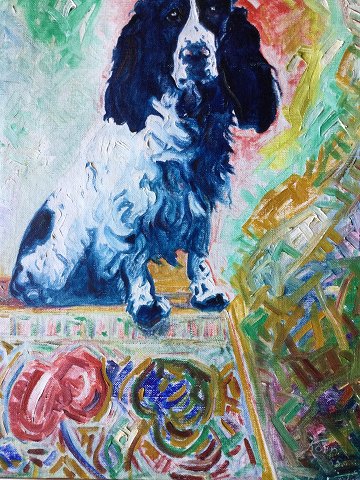 Hans Jørgen Korn (1888-1963): Siddende hund i interiør 1955 - antagelig en "Kleiner Münsterländer." Olie på lærred. Sign.: Korn - 55 66x46 (68x48) Et meget smuk og veludført maleri.