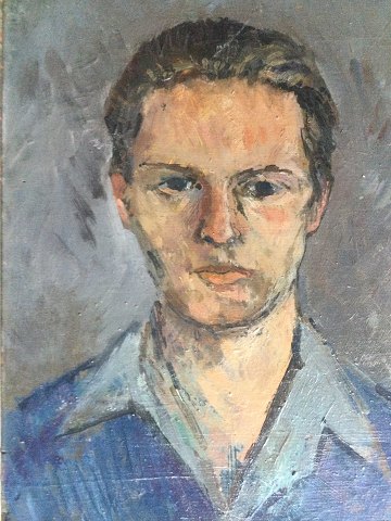 Ubekendt kunstner (20 årh): Portræt af ung mand - antagelig kunstmaleren Svend Wiig-Hansen (1922-97). Olie på plade. Sign.: B. Bagpå betegnet - EAS samt Svend Wiig-Hansen. 30x23 (35x28)