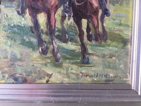 Thorvald Hansen (1878-1955): Hubertusjægere til hest i Dyrehaven. Olie på lærred. Enkelte krakeleringer. Sign.: Thorvald M. Hansen 55x80 (69x94) 32421