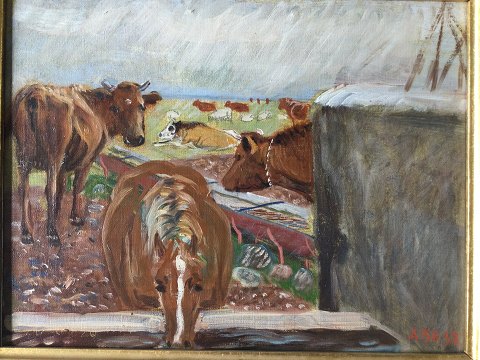 Heste og køer ved Gammelgaards Brønd, Saltholm 1957.