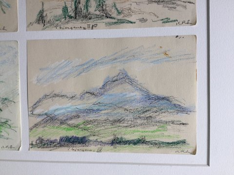 Ubekendt kunstner (20 årh): 4 bjerglandskaber i samme ramme. Oliekridt på papir. Indrammet i samme ramme uden glas. Betegnet "I Bjergene" nr. I, II, III og IV. Sign.: ICRL Indrammet 46x61 49121