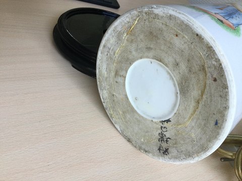 Polykromt dekoreret med skrifts tegn og scene med personer.