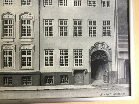 Elliot Hjuler (1893-1968): Gyldendals Gård i Klareboderne 3, København. Offset tryk på papir. Sign.: Elliot Hjuler i trykket. Indrammet i moderne aluramme. 29x47 14209