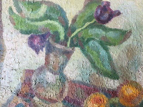 Opstilling med blomsterbuket og frugtfad på bord 1950.