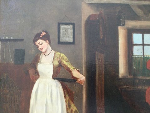 Jules Rousset (1840-1921): Værtshusscene fra rokokotiden. Olie på lærred. Sign.: Rousset 94. Lille reparation (se foto) Bagpå - stempel fra London. 45x55 (60x70) 28422