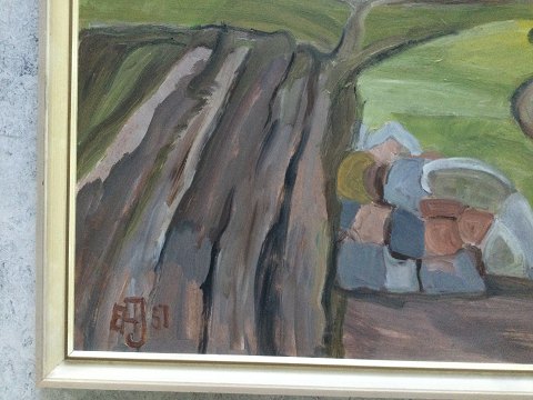 Eline Hertz-Jespersen (1879-1958): Landskab med nypløjede marker 1957. Olie på plade. Sign.. EHJ (monogram) 57. 62x65 (66x69) Eline Hertz Jespersen var gift med kunstmaler Knud Jespersen.