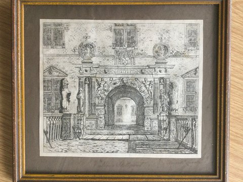 Thorald Læssøe (1816-78): Indkørselsporten på Vallø Slot 1839. Radering på papir. Sign.: Thorald Læssøe 1839 (Spejlvendt i trykket) 18x21 (25x28)