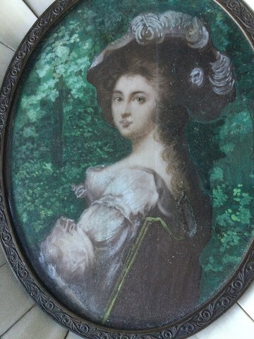Ubekendt miniature maler (19 årh): Portræt af ung dame med fjerprydet hat i havelandskab. Gouache på ben. Sign.: usigneret Indrammet i lettere defekt og bulet benramme. Mål: 8½ x 6½ (14x12)