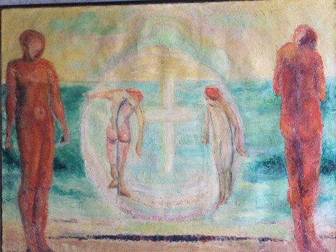 Komposition med Nøgen mennesker på stranden og et Kors.