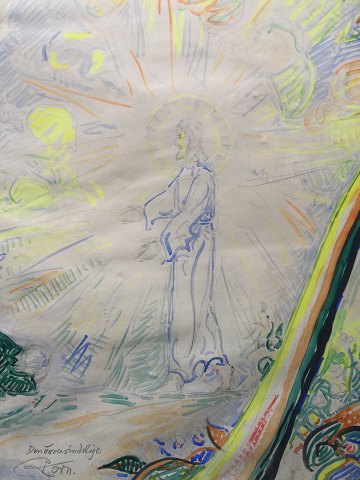 Hans Jørgen Korn (1888-1963): Kristus den Uovervindelige. Akvarel på papir. Sign.: Korn Betegnet - Den Uovervindelige 54x74 (58x79) En meget smuk og veludført komposition. 11225