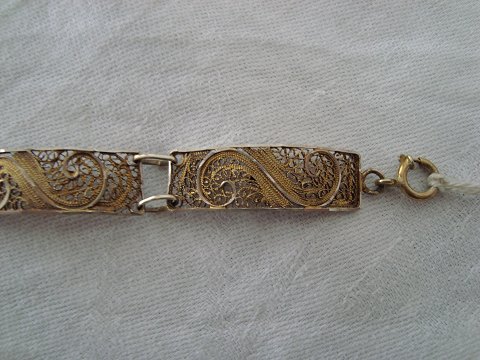 Armlænke af forgyldt sølv. 5 filigran led med ringe i mellem. Stemplet: Mange utydelige stempler. Længe armlænke - 19 cm. Ledstørrelse - 1 cm x 5 cm