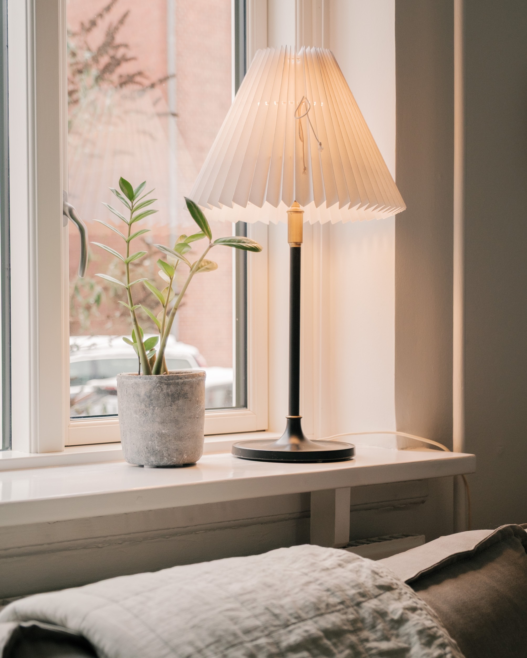 Det første der møder dig, er det bløde, varme lys fra en Le Klint Model 352 bordlampe. Lyset falder stille over rummet og skaber en rolig, indbydende stemning, der inviterer til fordybelse. En lampe der ikke blot oplyser, men tilfører rummet karakter, blødhed og klassisk nordisk elegance.