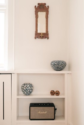 Flere steder i hjemmet finder du Royal Copenhagen porcelæn, som tilfører lethed og elegance. De klassiske mønstre og fine detaljer binder indretningen sammen og bringer et strejf af tradition ind i det moderne nordiske udtryk.