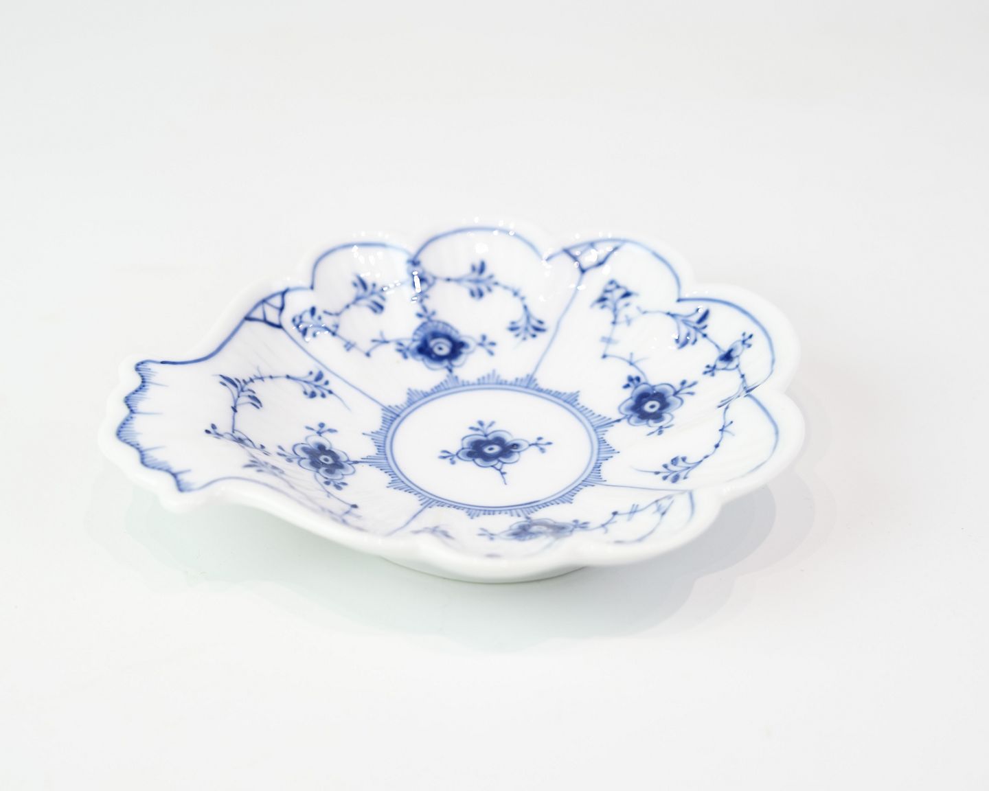 The dish in the classic blue-fluted pattern from Royal Copenhagen. This small serving bowl, model no. 2013, is hand-painted and dates from the period 1923–1935, which is confirmed by the stamp. The shape is slightly oval and has the characteristic blue-white porcelain.
