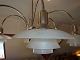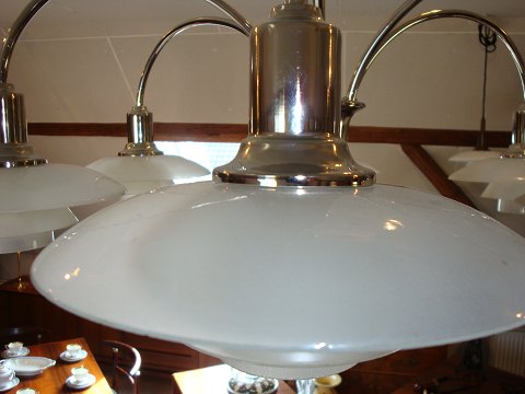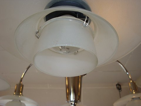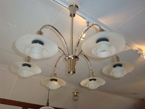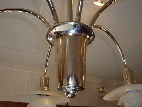 SolgtPH Bombardementskrone i forniklet metal med 6 arme fra år ca 1940 med orginale skærme i mat glas