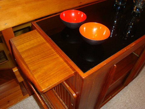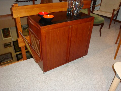 SolgtBar i teaktræ med jalousidøre og udtræksklap dansk design fra 1960érne