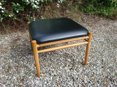 SolgtSkammel i eg med sort læder - Sædet kan vendes og bruges som bord. Dansk Design fra 1960érne.