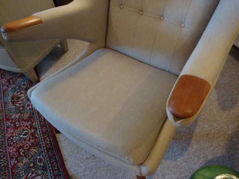 SolgtBamsestol "Øreklapstol" AP19 Design fra 1951 af Hans J. Wegner 1914-2007. Stolen måler 99cm i højden, 55 cm i bredden, 90cm i længden og i sædehøjden 43cm. Stolen er i lyst uld med poter og ben i teaktræ.