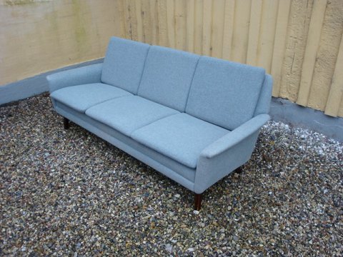 Solgt3 personers sofa i lyseblåt stof.