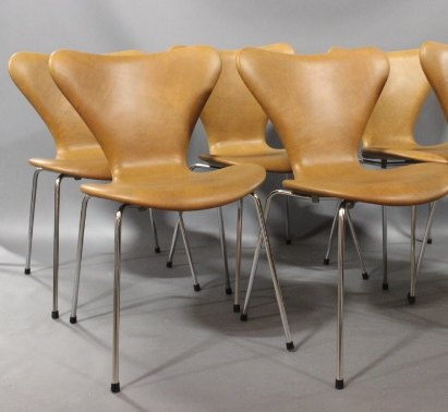Solgt6 stk Arne Jacobsen Model 3107. Nypolstret med cognac farvet patineret læder i fin stand