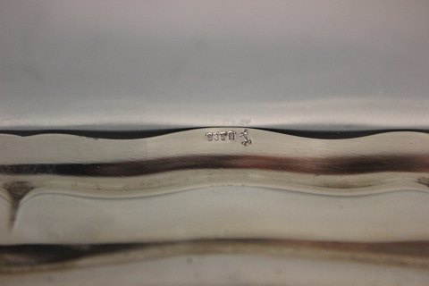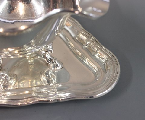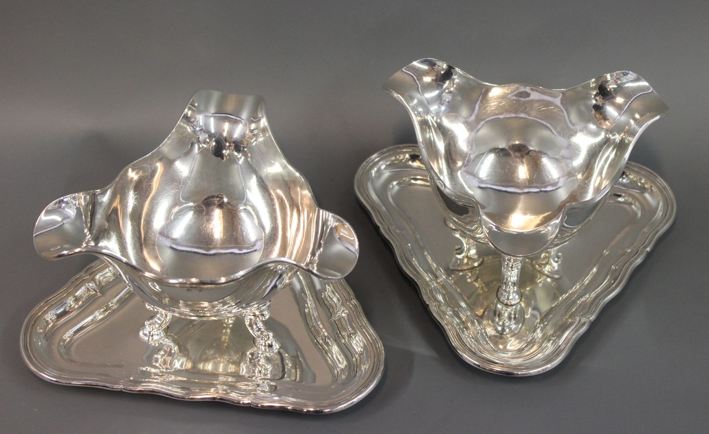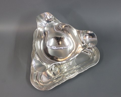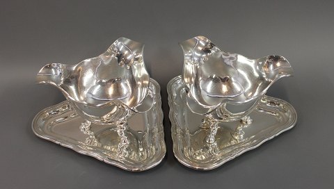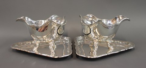 Et par sølv sovseskåle på fødder monteret på trekantet sølv bakke.