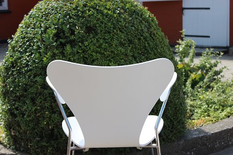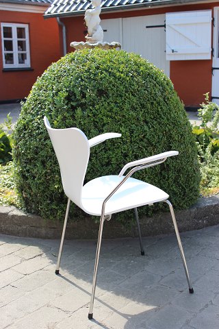 Solgt4 hvide syver stole, model 3107, med armlæn, designet af Arne Jacobsen og produceret af Fritz Hansen. Stolene er produceret i 2008, men designet i 1950erne.