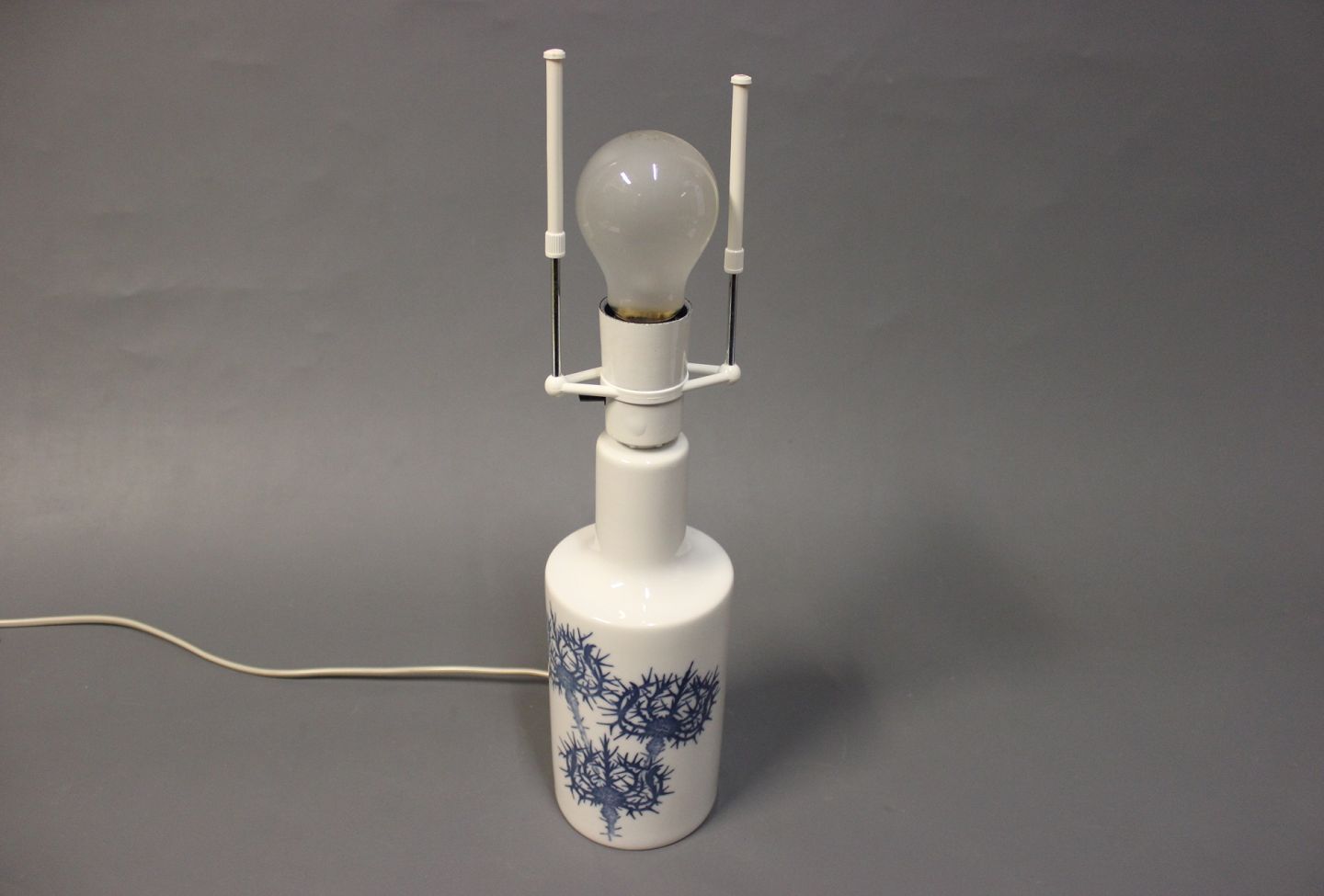 SolgtRoyal Copenhagen bordlampe dekoreret med blå tidsler. Ny lampeskærm kan tilkøbes.