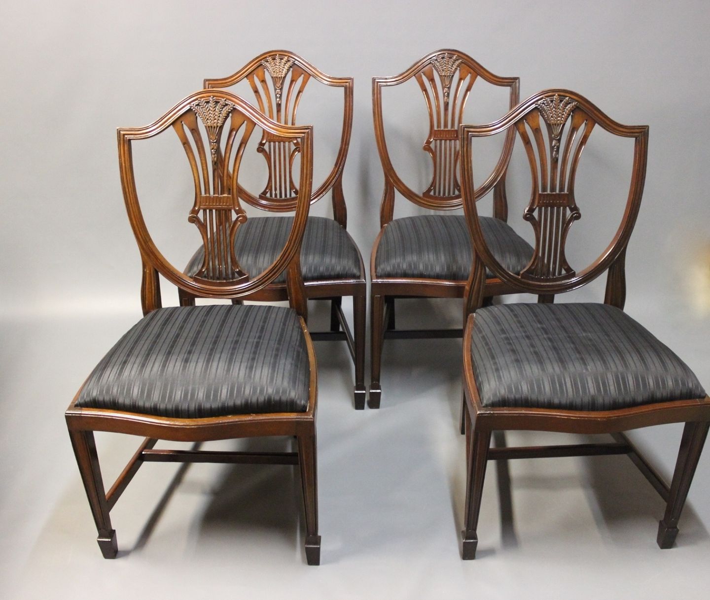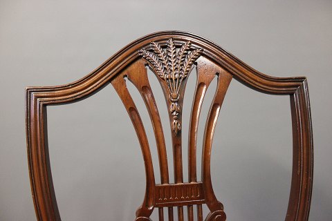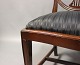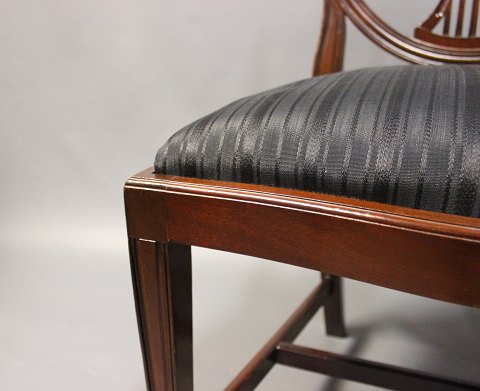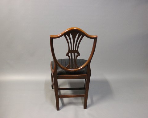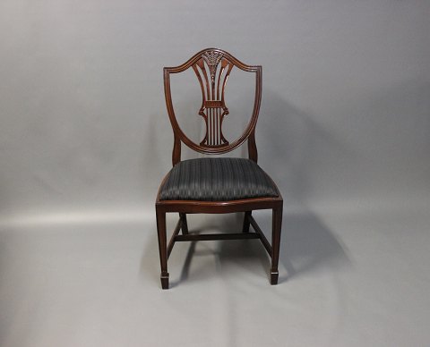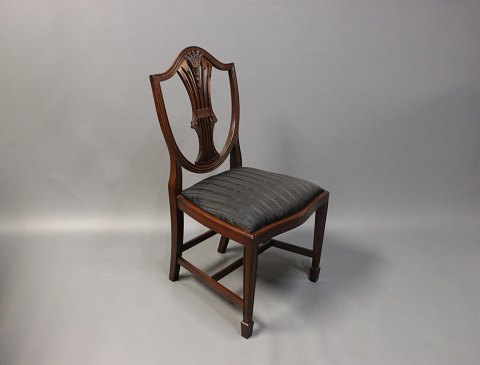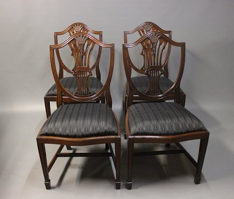 SolgtEt sæt af fire heppelwhite spisestole i poleret mahogni og sort stof. Stolene er fra England og 1920erne. Bord i samme stil kan tilkøbes, billeder sendes hvis ønsket.