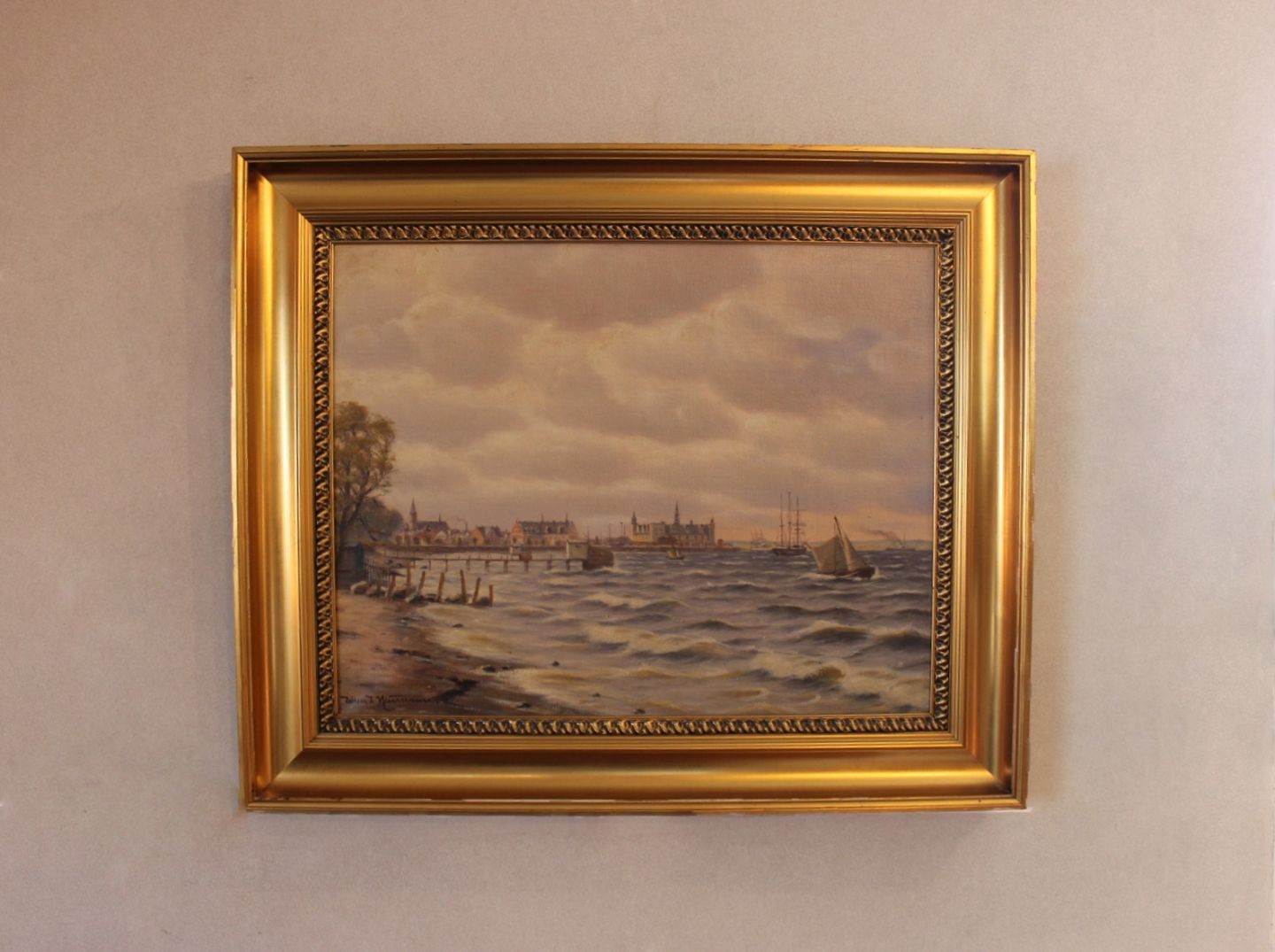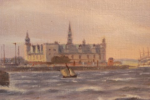 Maleri af marinemaleren Johan Neumann fra omkring 1910. Maleriet forestiller Øresund med Kronborg i baggrunden.