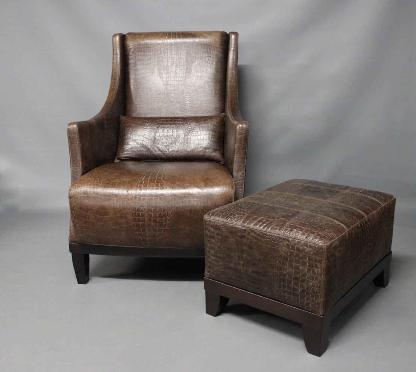 A pair of easy chairs in dark Brown leather with stools from the Italian brand Smania.