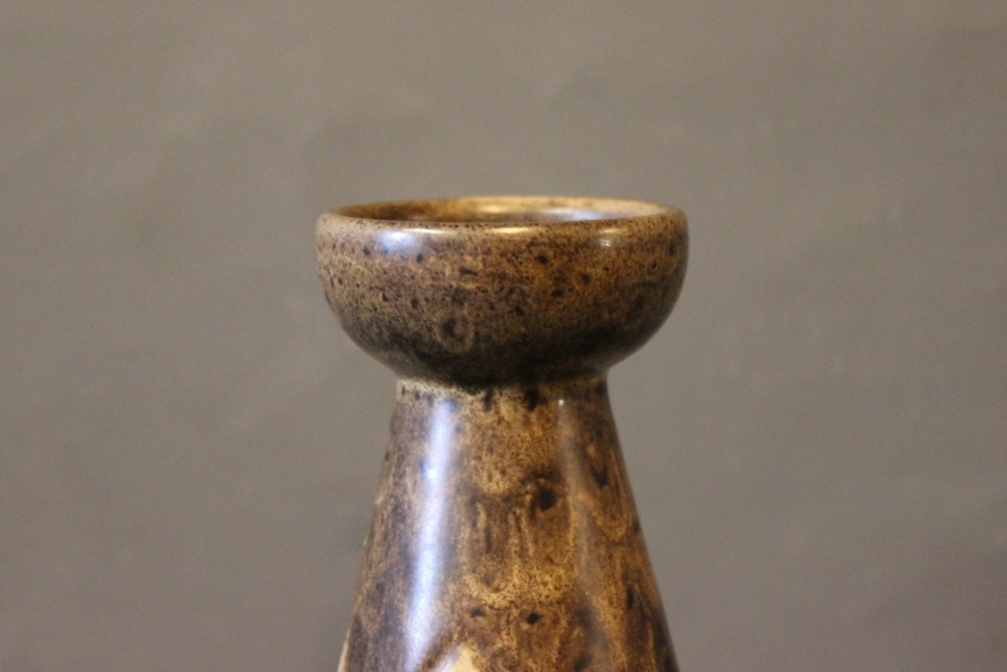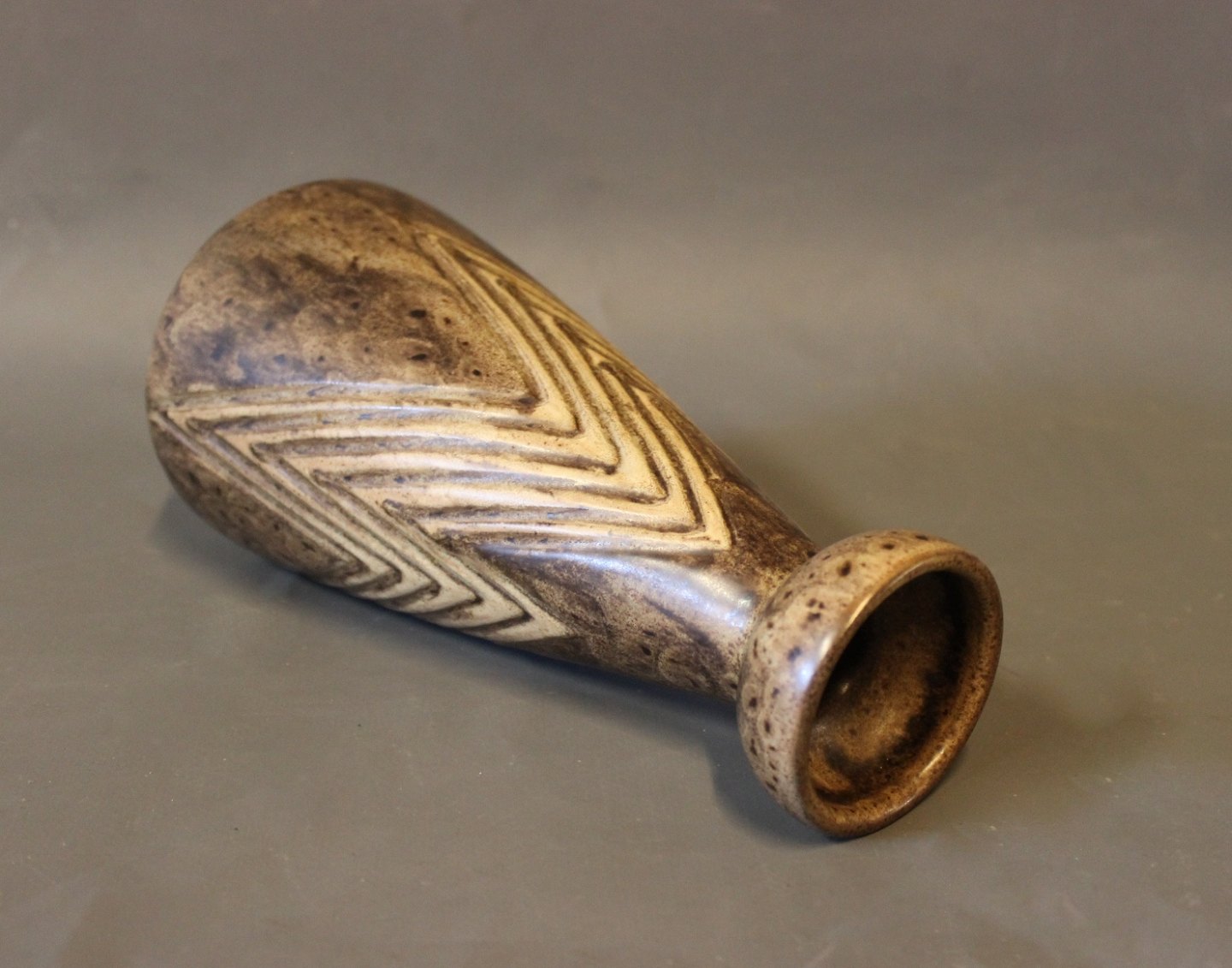SolgtVase af Løvemose i brunlig farve og lyst mønster.