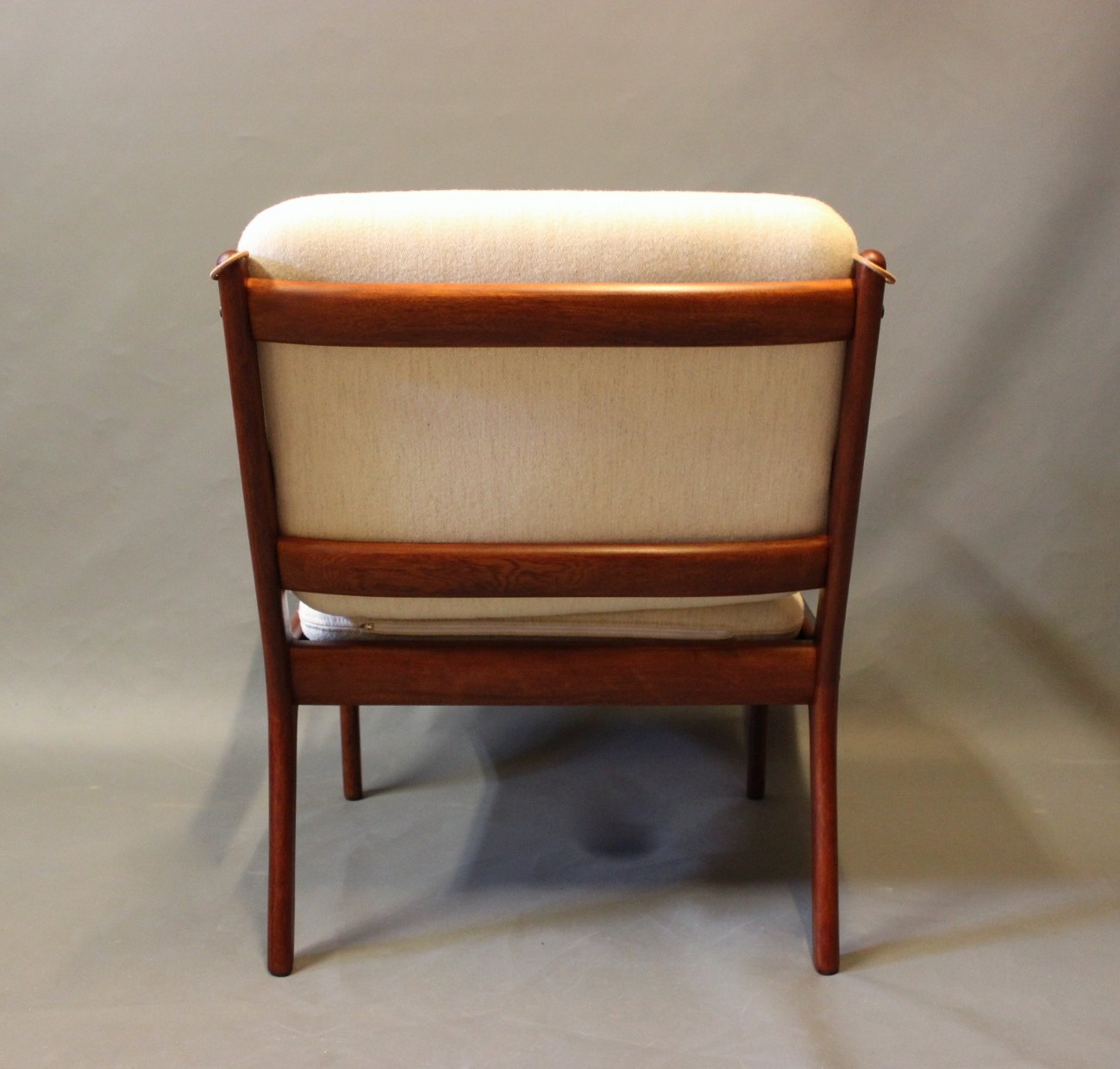 SoldPJ112 easy chair in polished mahogany and with cushions in light wool, designed by Ole Wanscher and manufactured by P. Jeppesen.