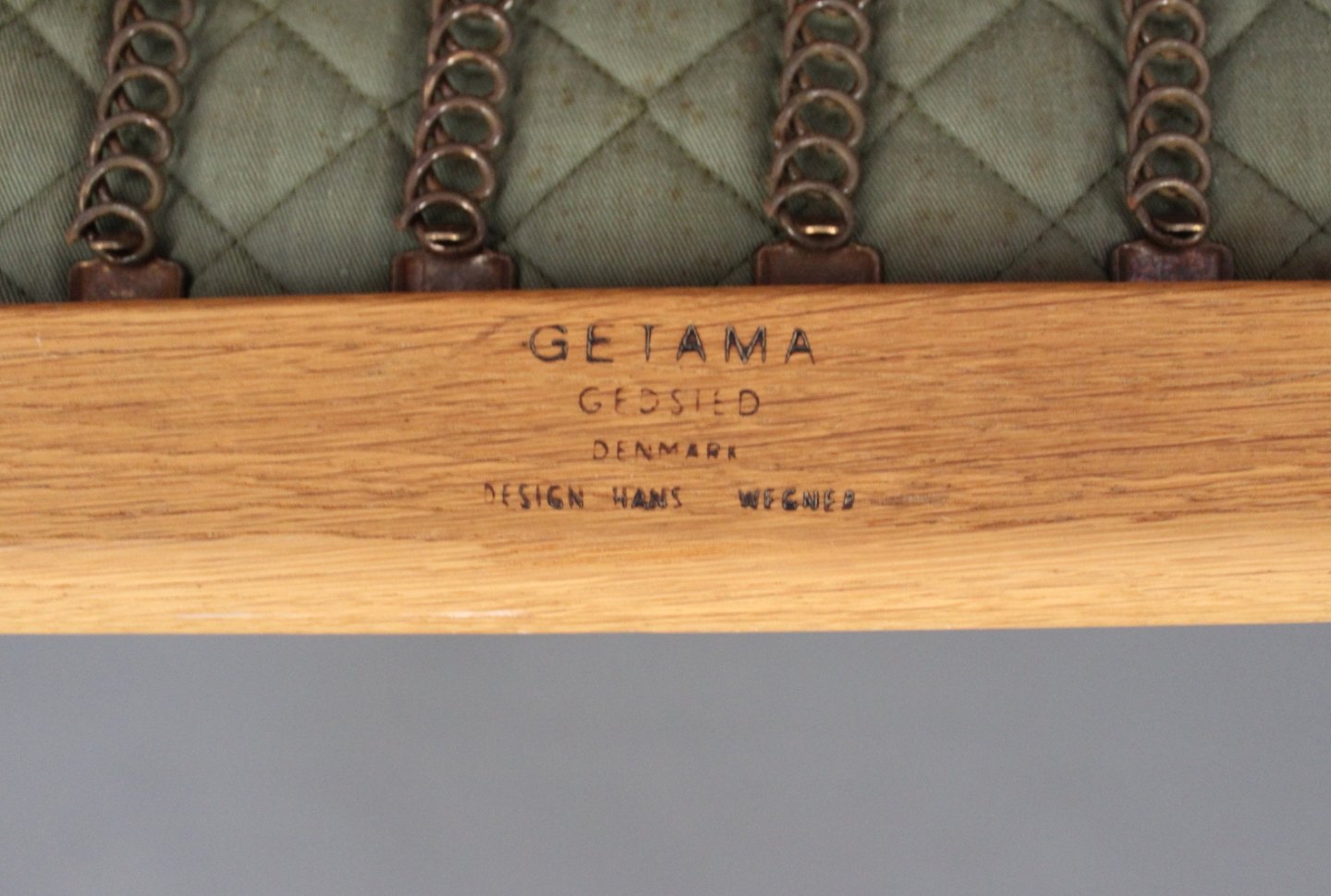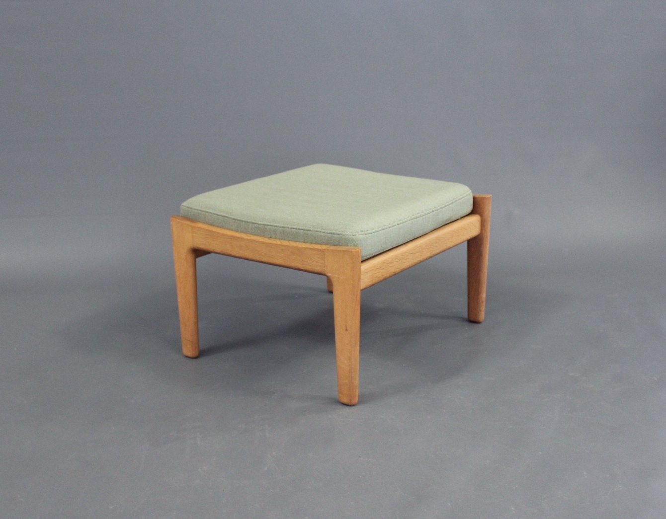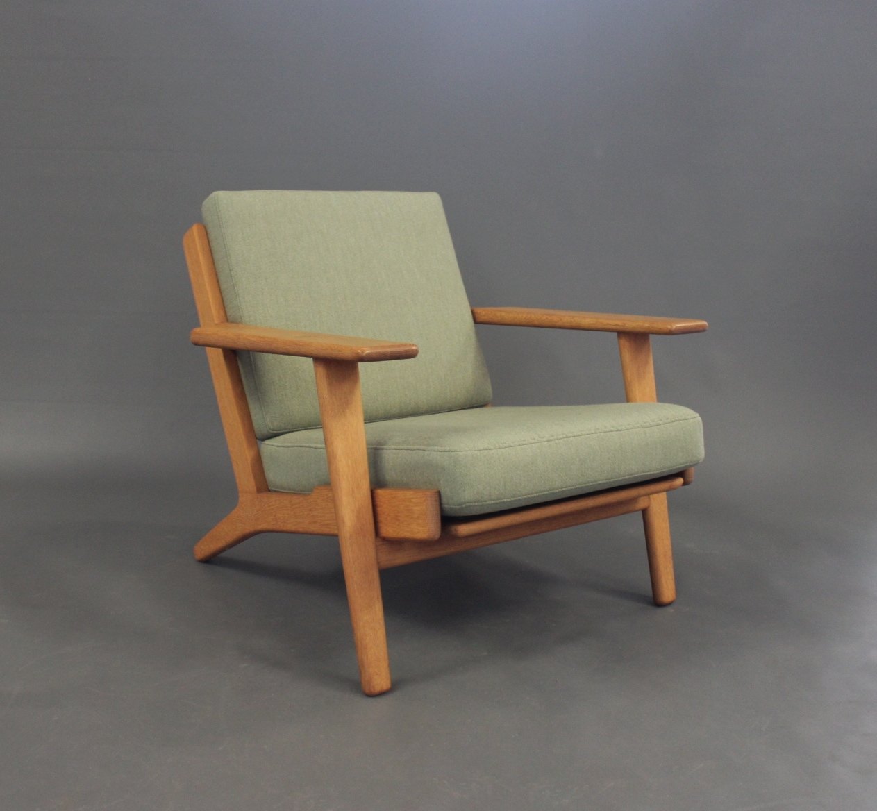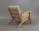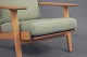 SolgtArmstol, model GE290, samt tilhørende skammel, designet af Hans J. Wegner i 1950erne og fremstillet hos GETAMA i 1960erne. Stolen og skamlen er af eg og hynder polstret med lysegrønt Hallingdal uld.