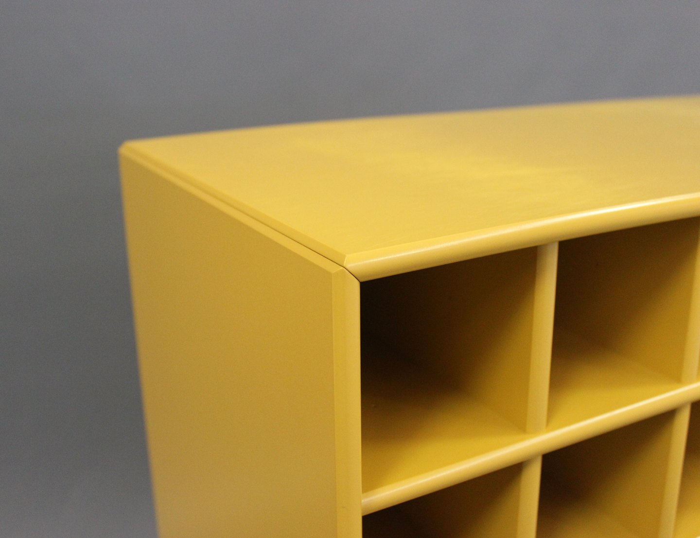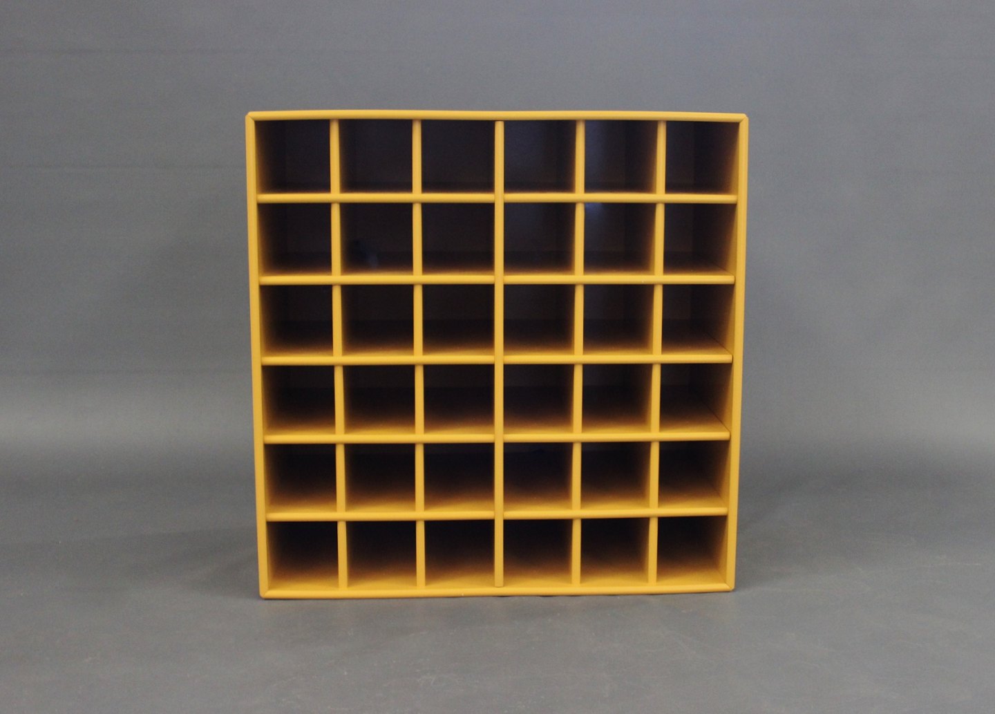 SolgtReol i gul af Montana med 36 mindre rum til vin eller lignende. Vi har mange forskellige reoler af Montana på lager, kontakt for nærmere info.