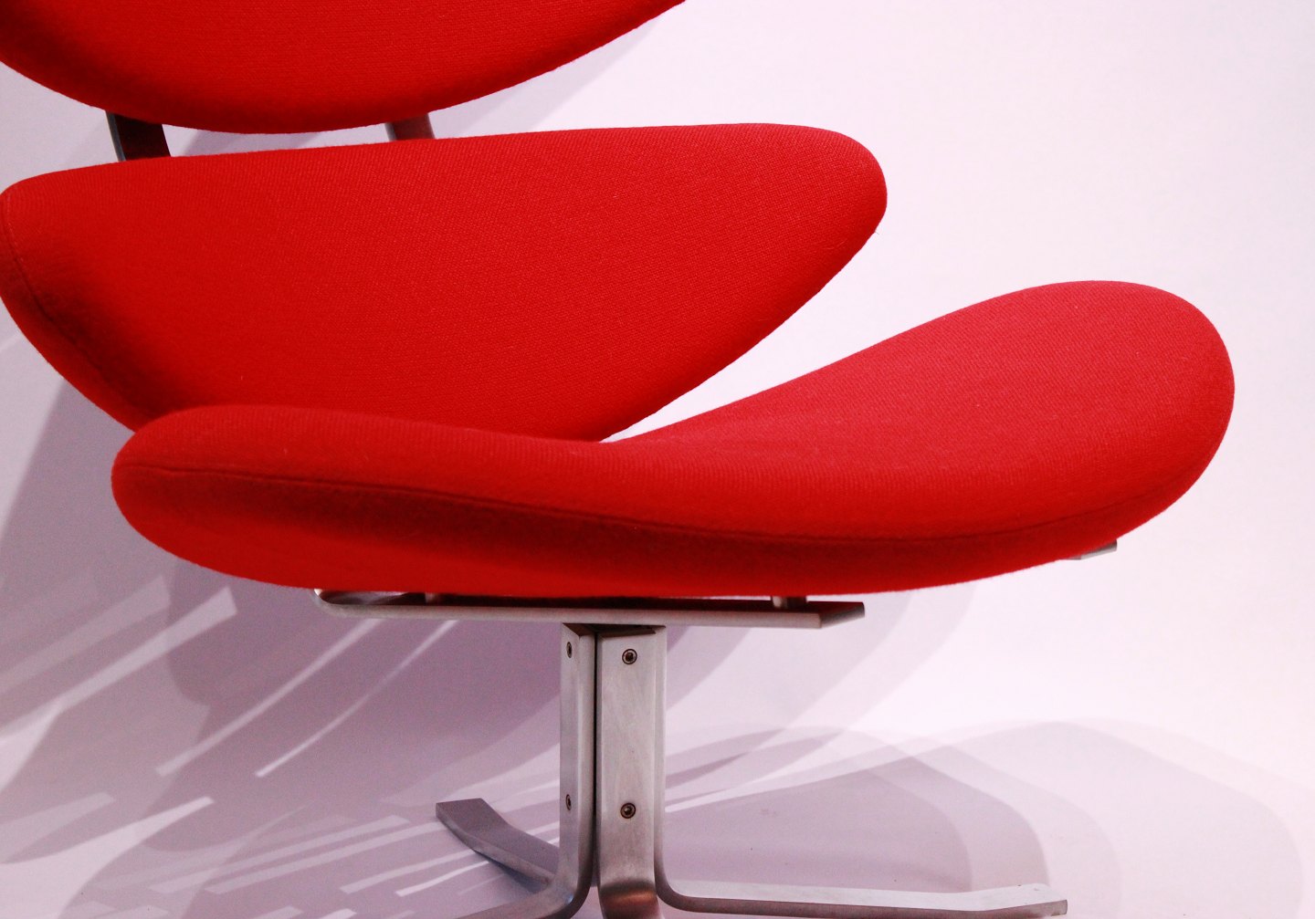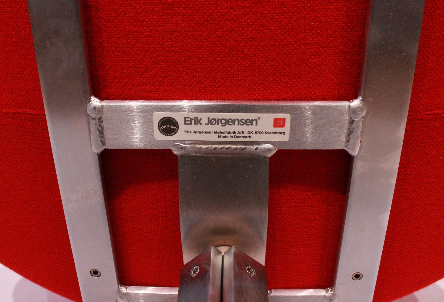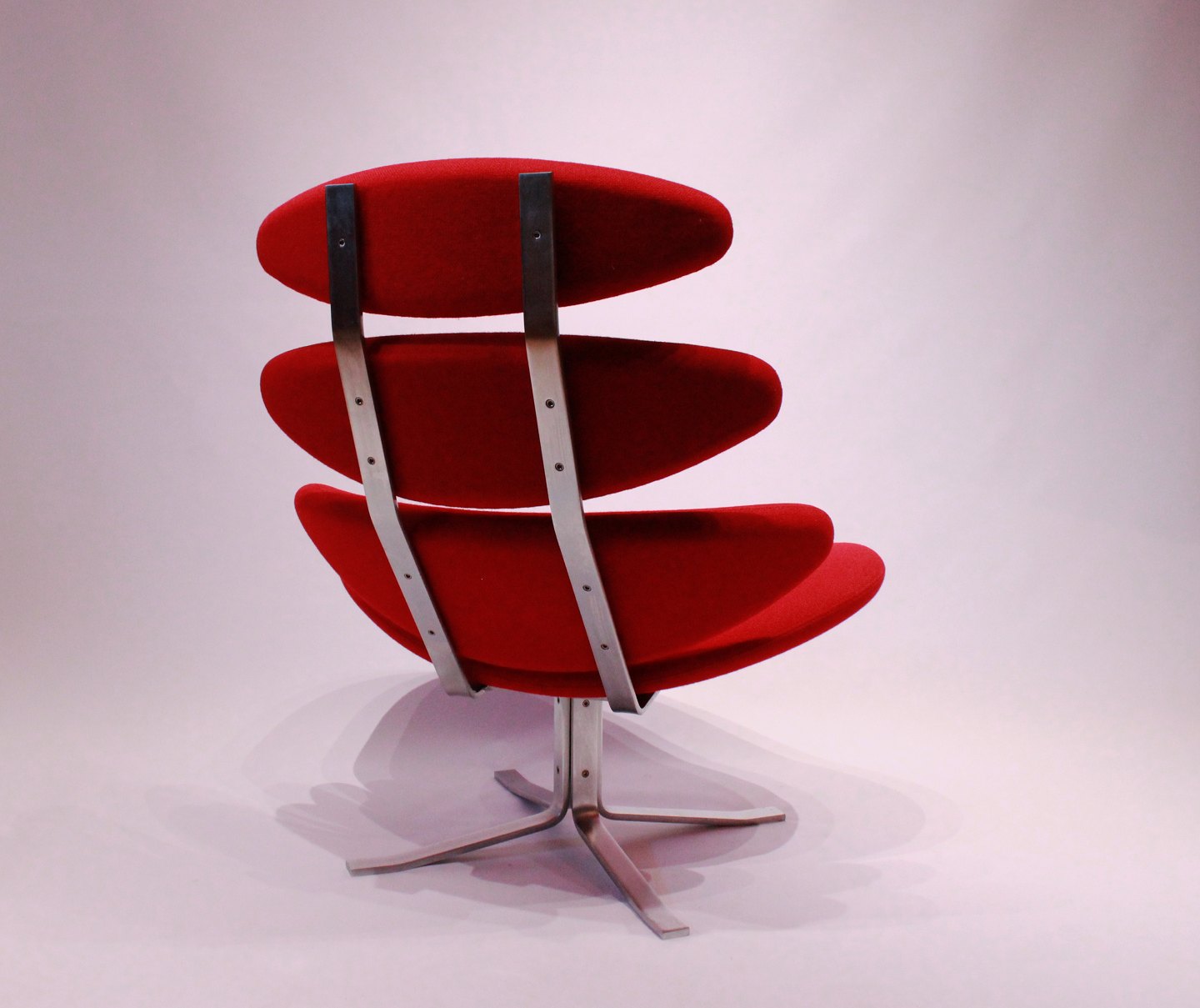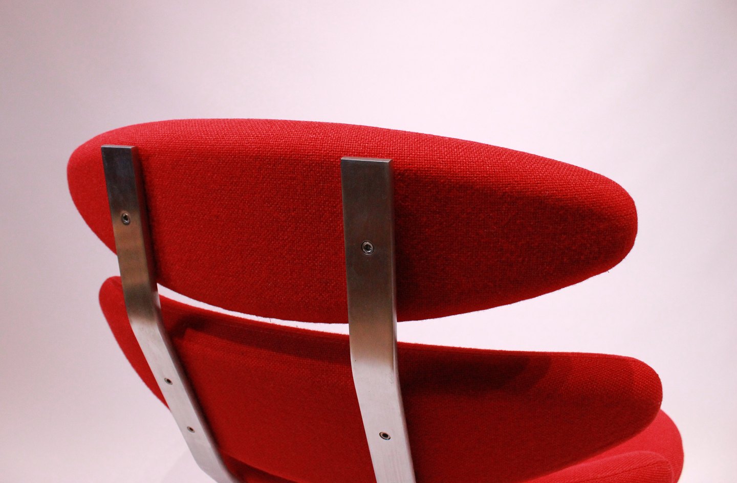 SolgtCorona, model EJ 5, designet af Poul M. Volther i 1964 og fremstillet hos Erik Jørgensen. Stolen er polstret med rødt uldstof.