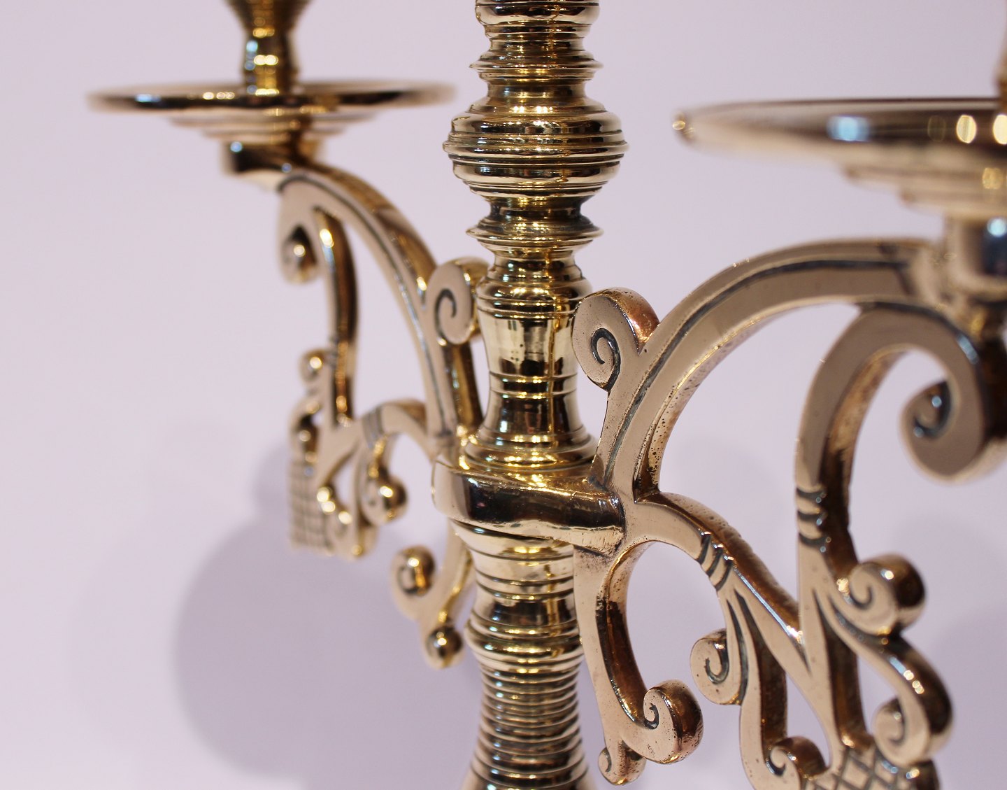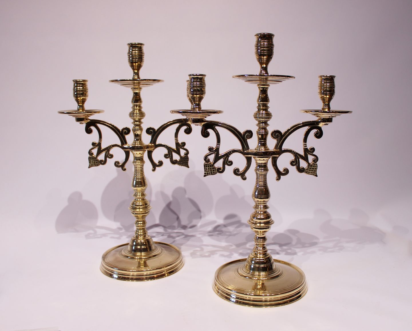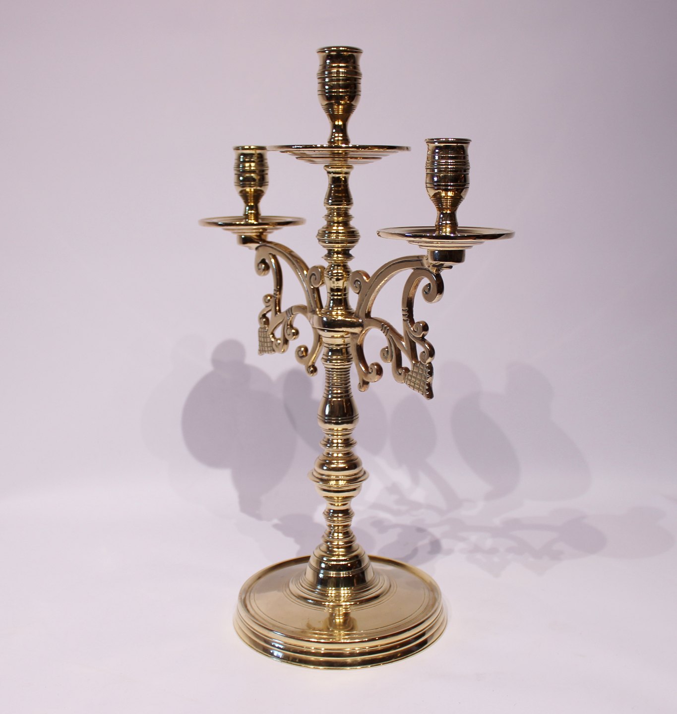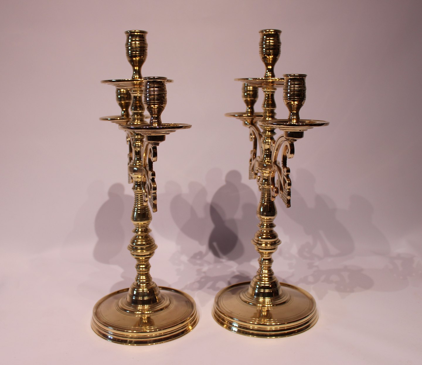 Et sæt store trearmede messing lysestager, i flot brugt stand fra omkring 1890erne.