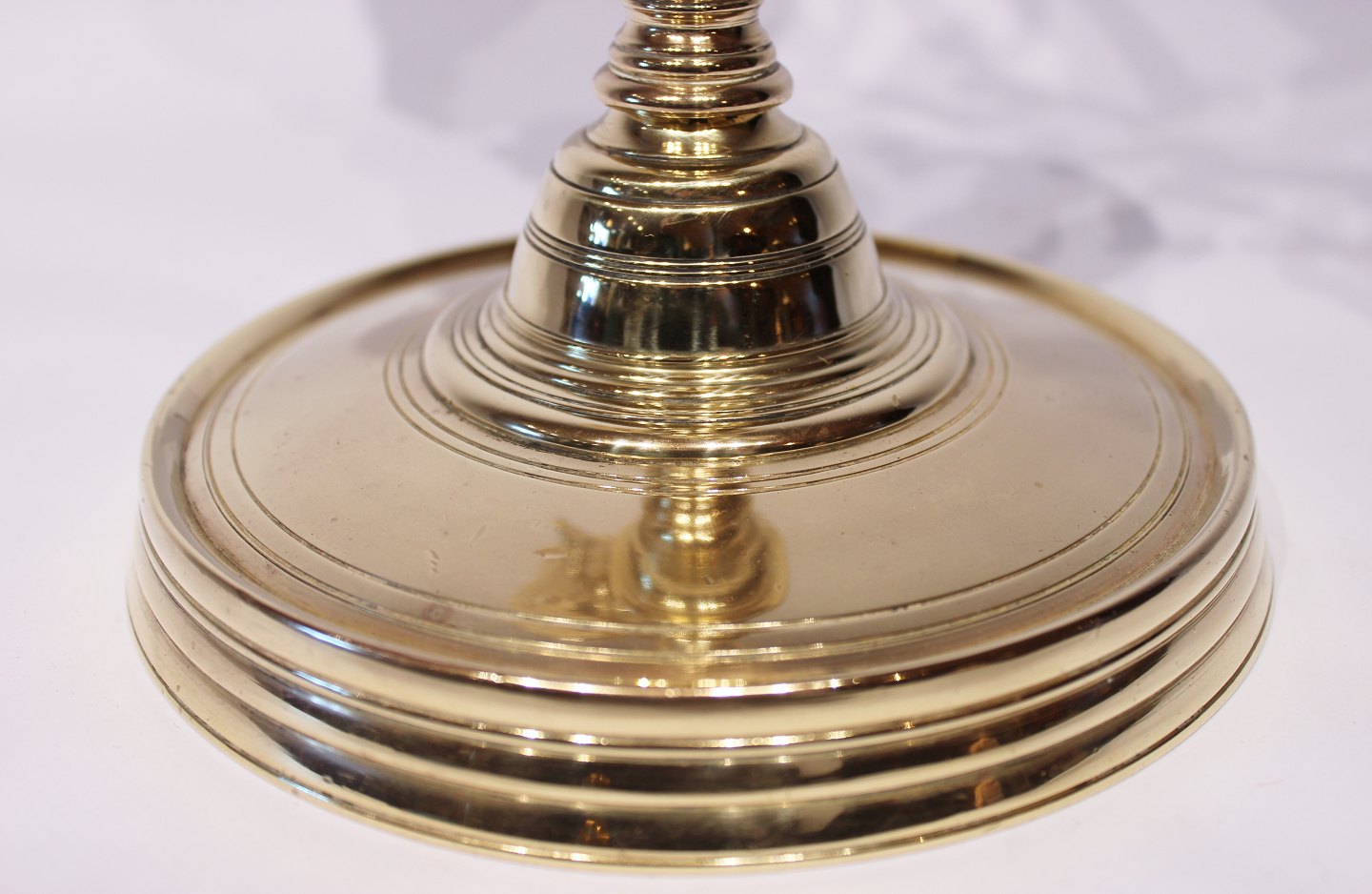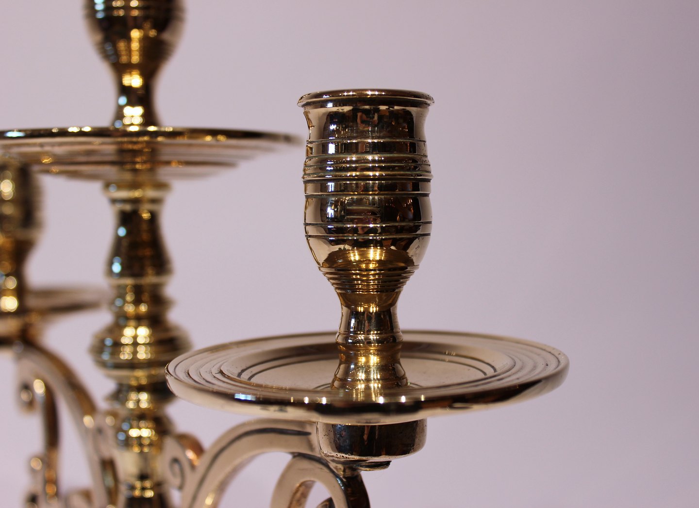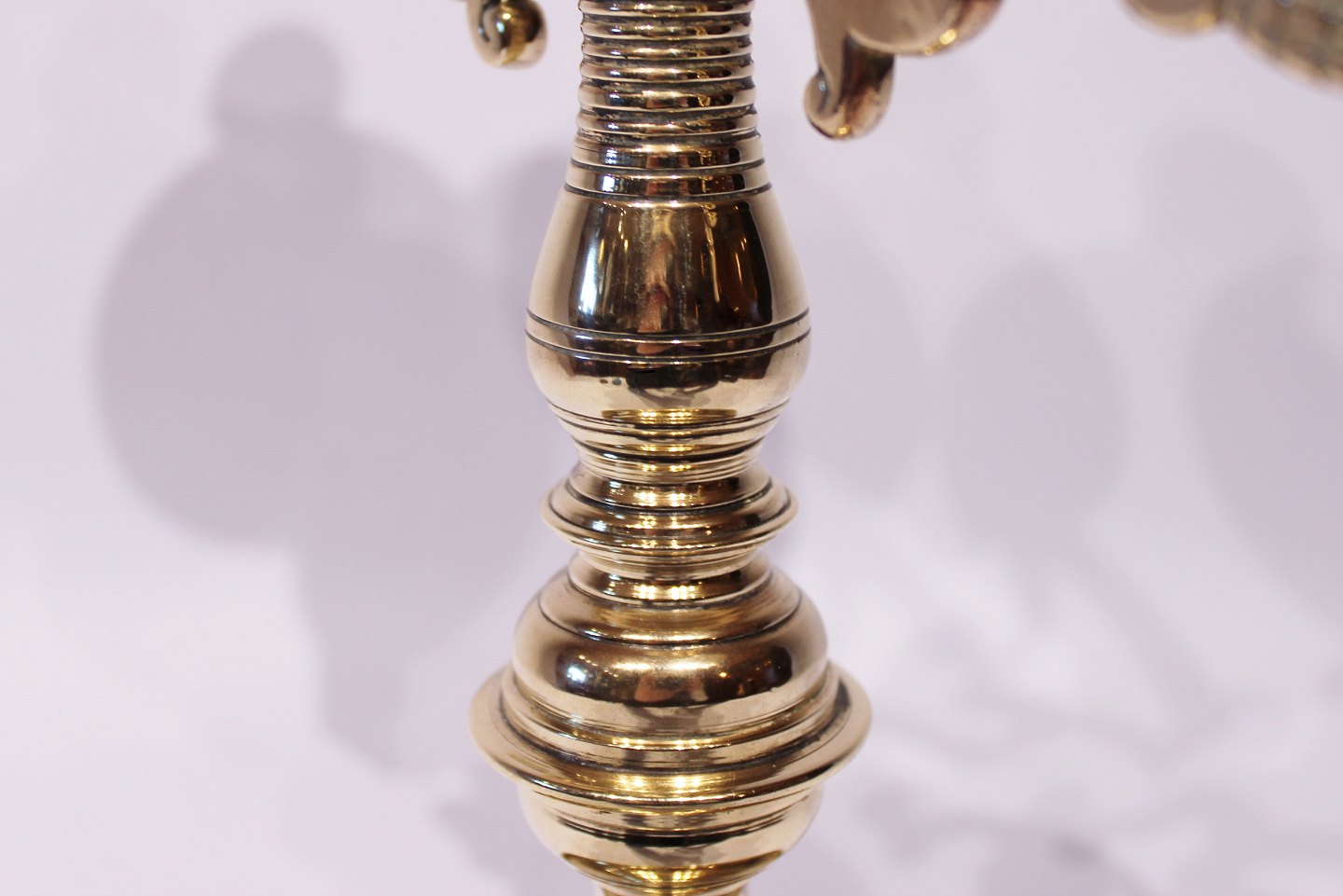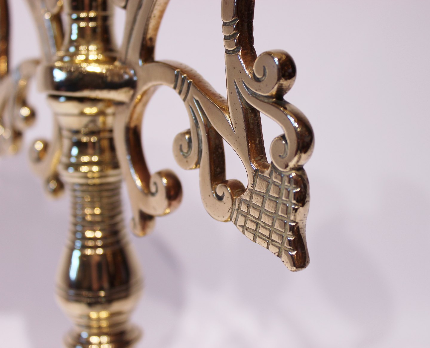 Et sæt store trearmede messing lysestager, i flot brugt stand fra omkring 1890erne.