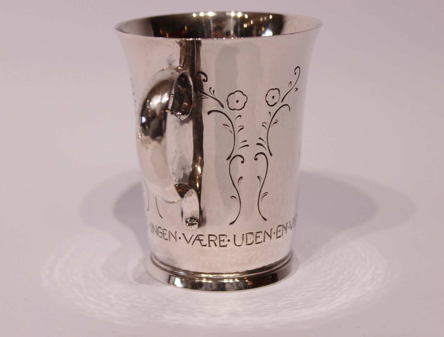 SolgtBørnekrus med tekst fra Prinsessen på Ærten fra 1929 i tretårnet sølv stemplet EN af Evald Nielsen. Kruset er dekoreret med teksten "Saa ømskindet kunde ingen være uden en virkelig prinsesse".