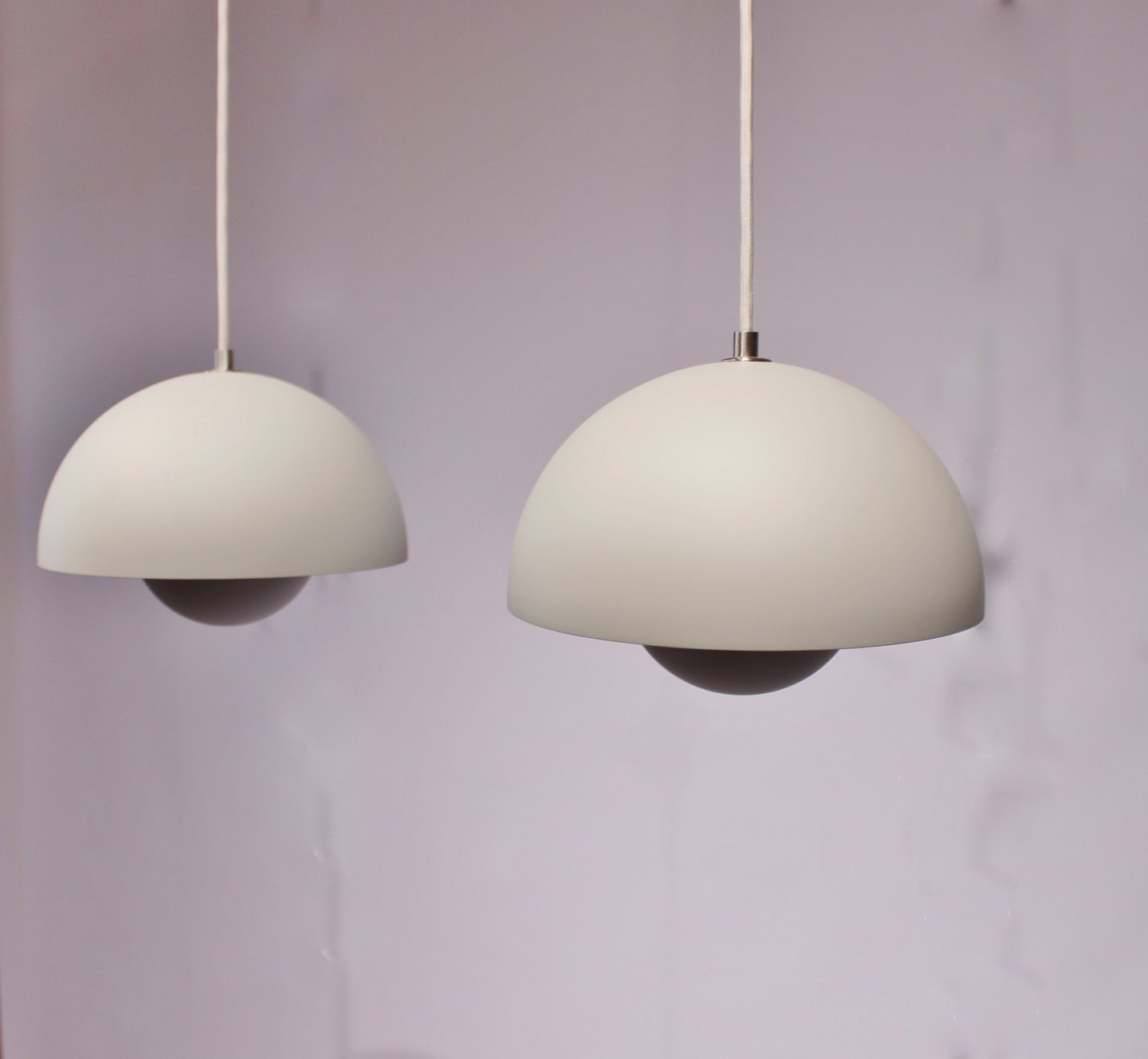 Et par Flowerpot, model VP1, pendler i mat grå af Verner Panton og &Tradition.