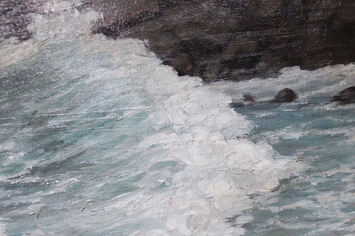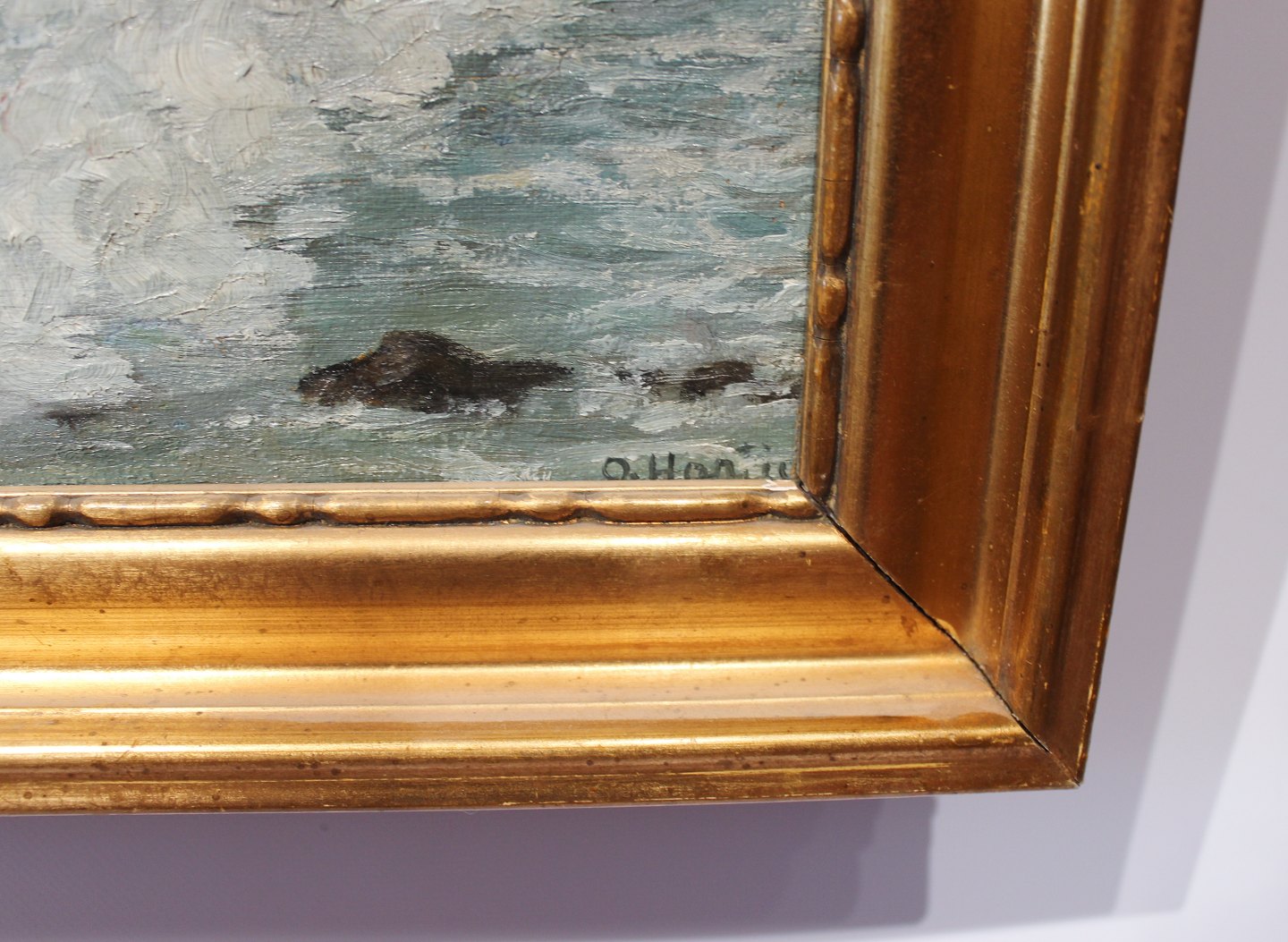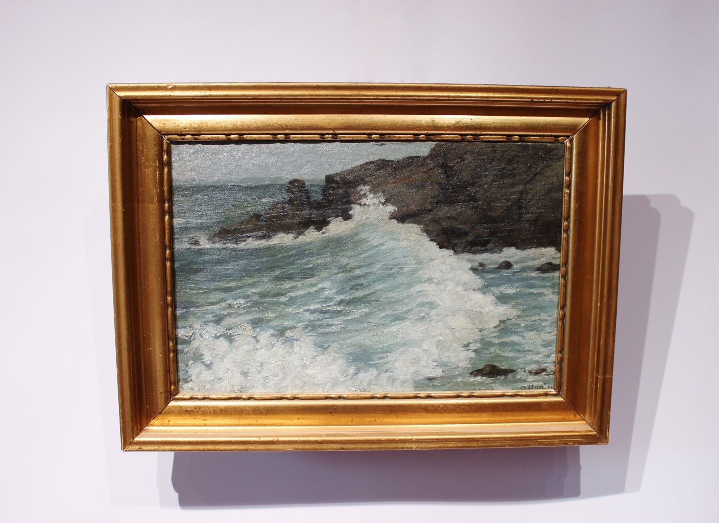 Oliemaleri med motiv af bølger på en dansk stand og med forgyldt ramme. Maleriet er signeret af en ukendt dansk kunstner.