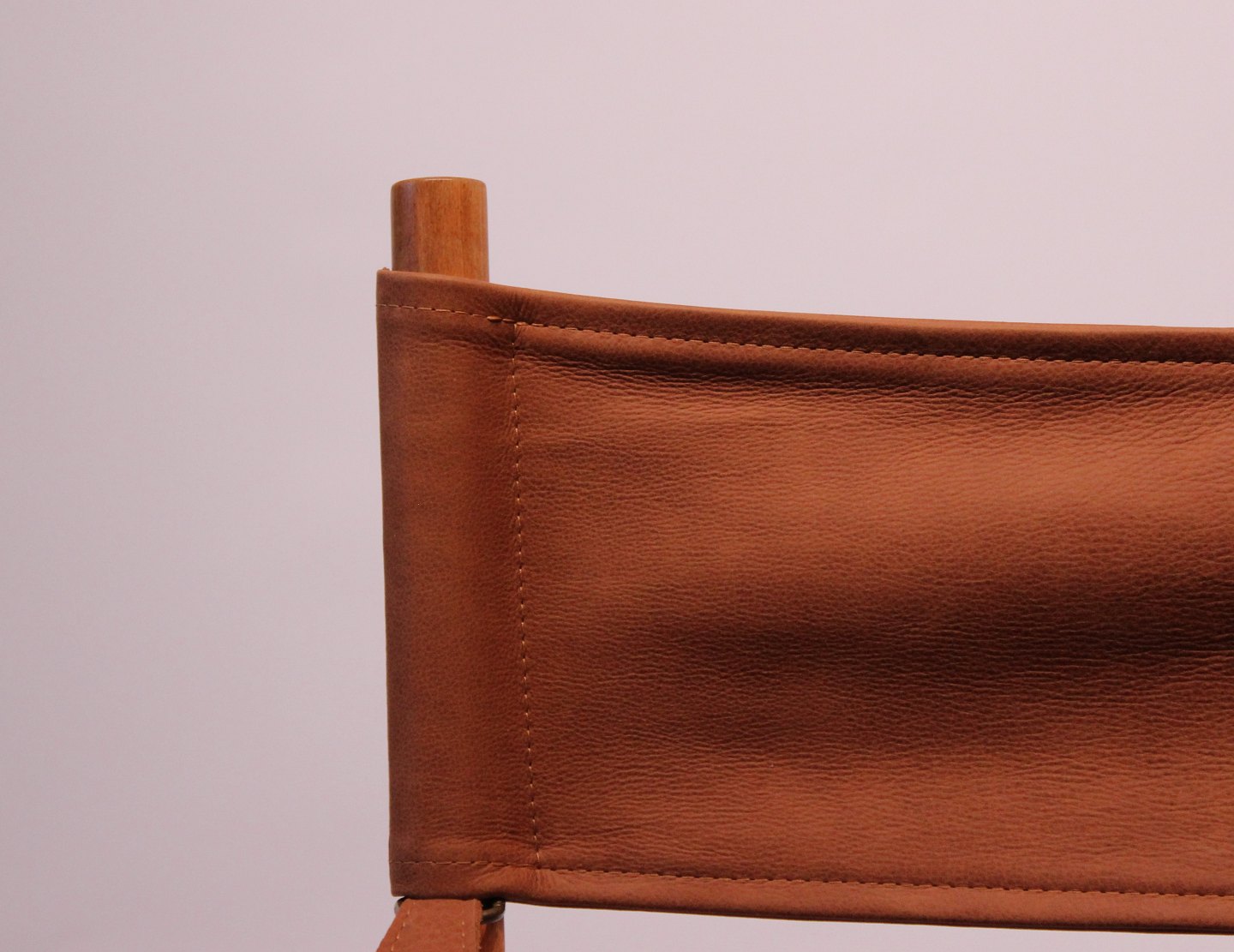SolgtSæt af tre klapstole, model MK99200, designet af Mogens Koch i 1932 og fremstillet af Interna Danmark i 1960erne. Stolene er i poleret bøg, med messing ringe og brunt patineret læder.