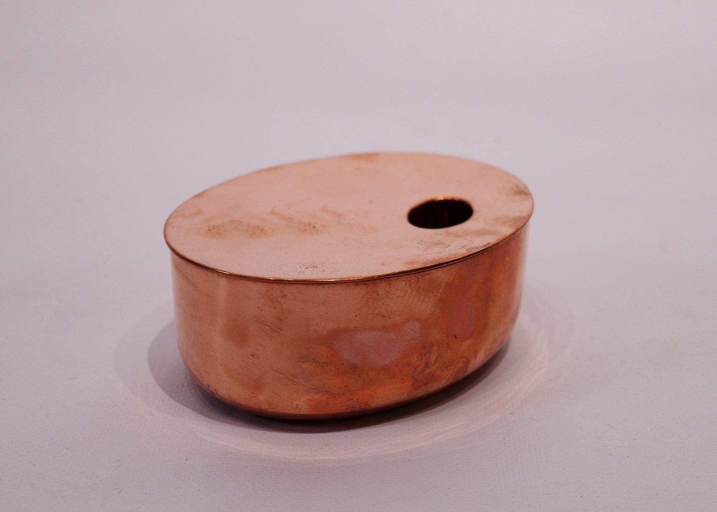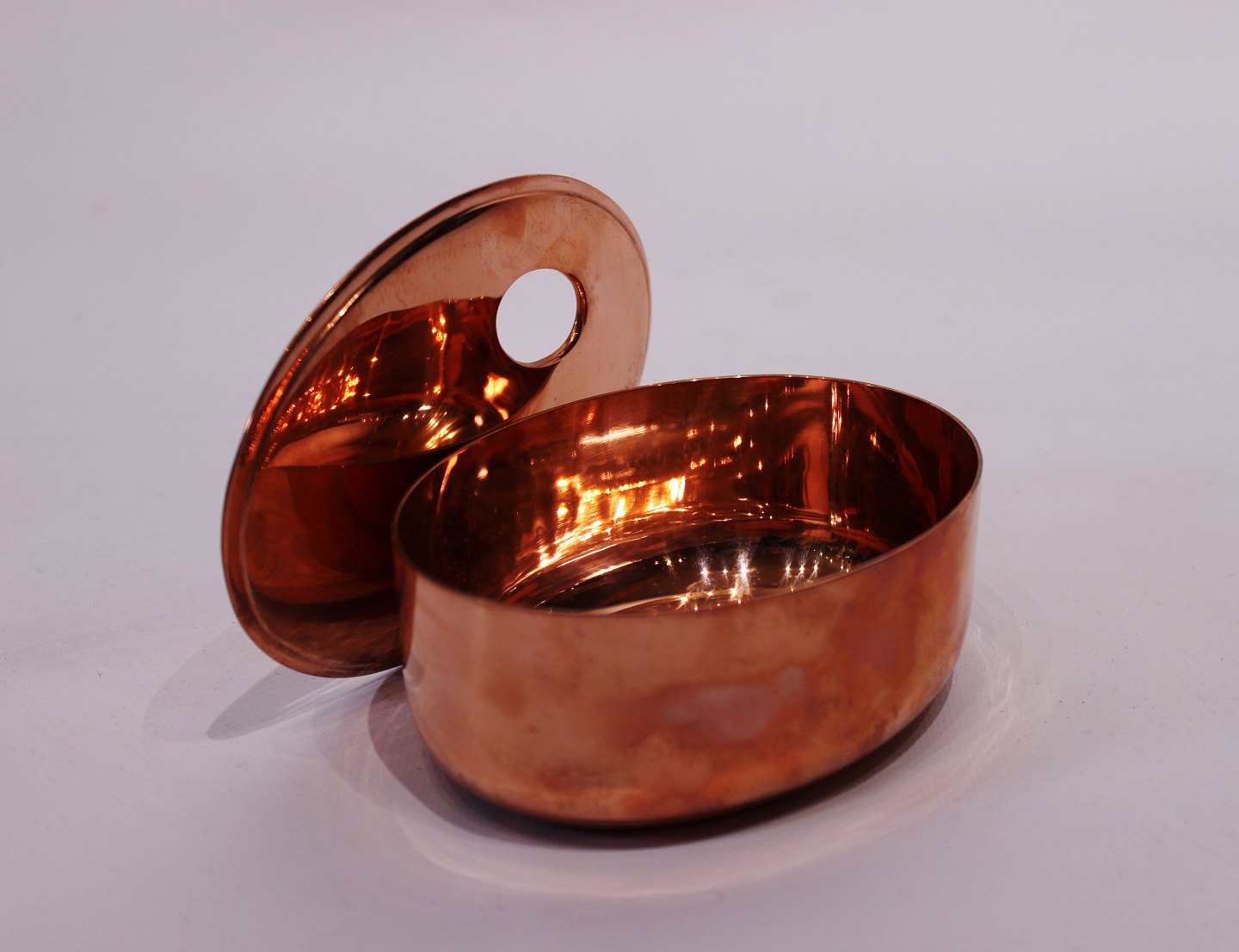 Small bowl with lid in copper designed by Ilse Crawford in 2012 for Georg Jensen.