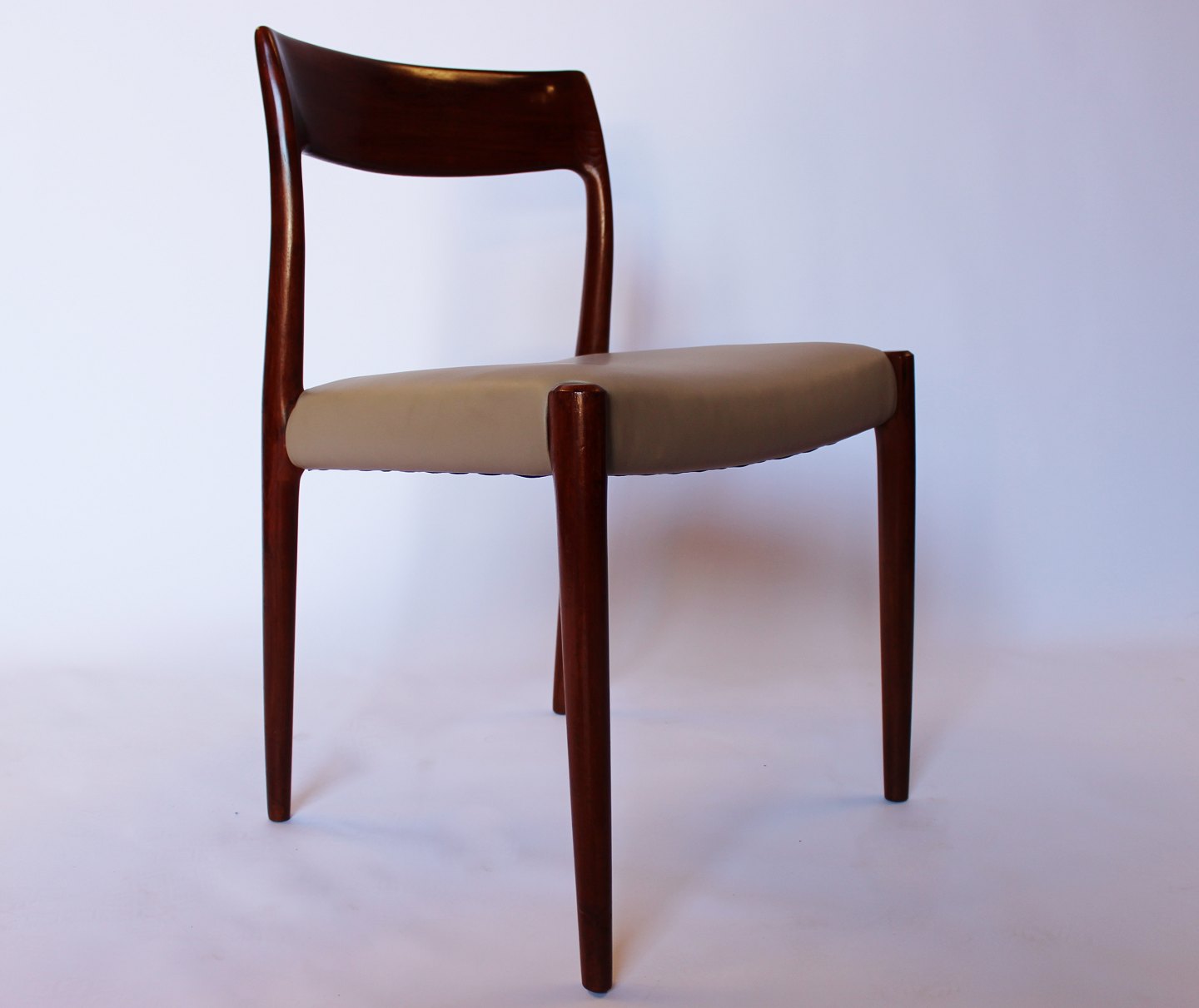 SoldSet of 6 dining chairs, model 77, in teak and light grey leather designed by N.O. Møller and manufactured by J.L. Møller furniture factory in the 1960s.