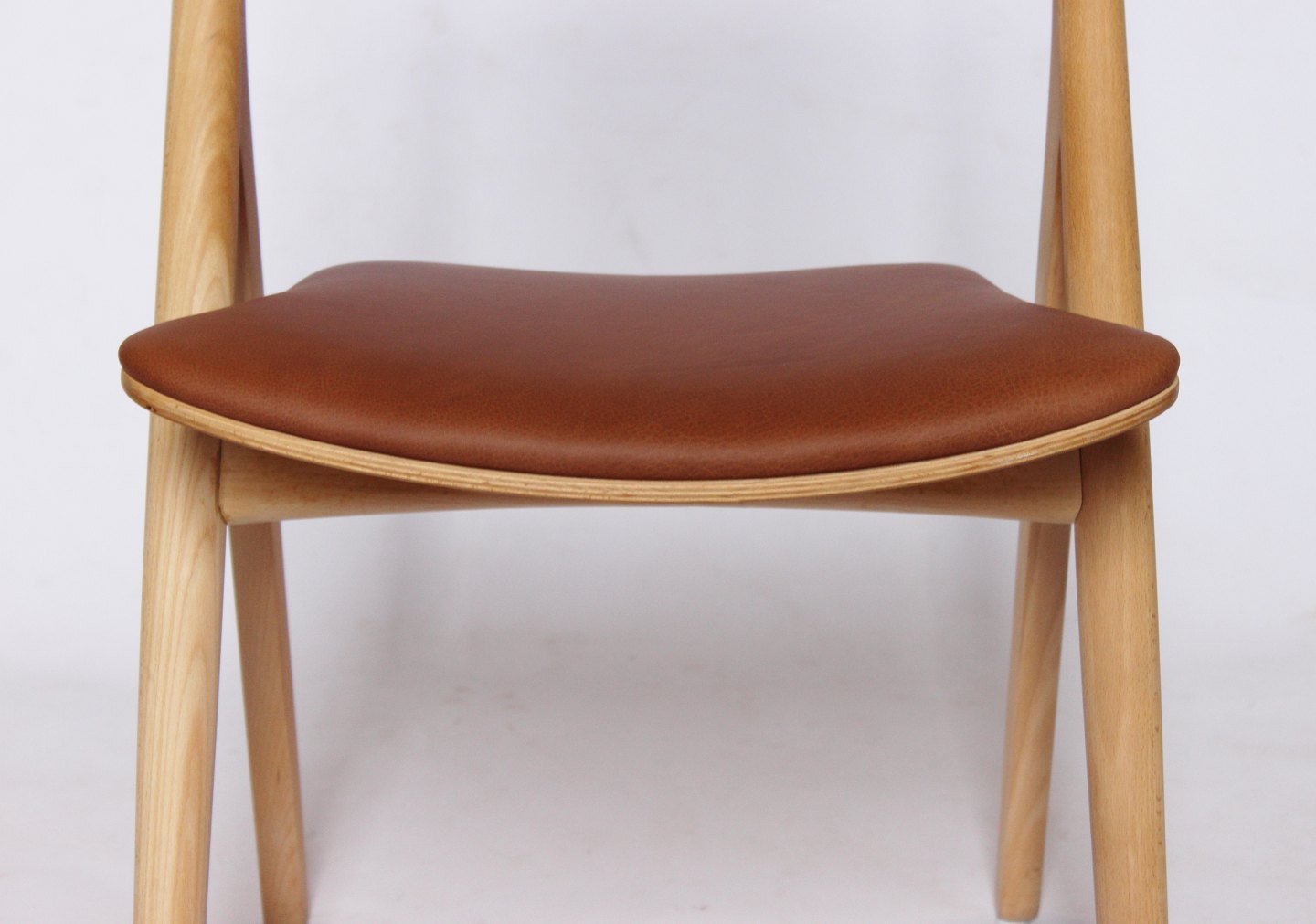 Et sæt af 5 Savbuk stole, model CH29, designet af Hans J. Wegner i 1952 og fremstillet af Carl Hansen & Søn i 1970erne. Stolene er af sæbebehandlet bøg og med sæder af cognac elegance læder.