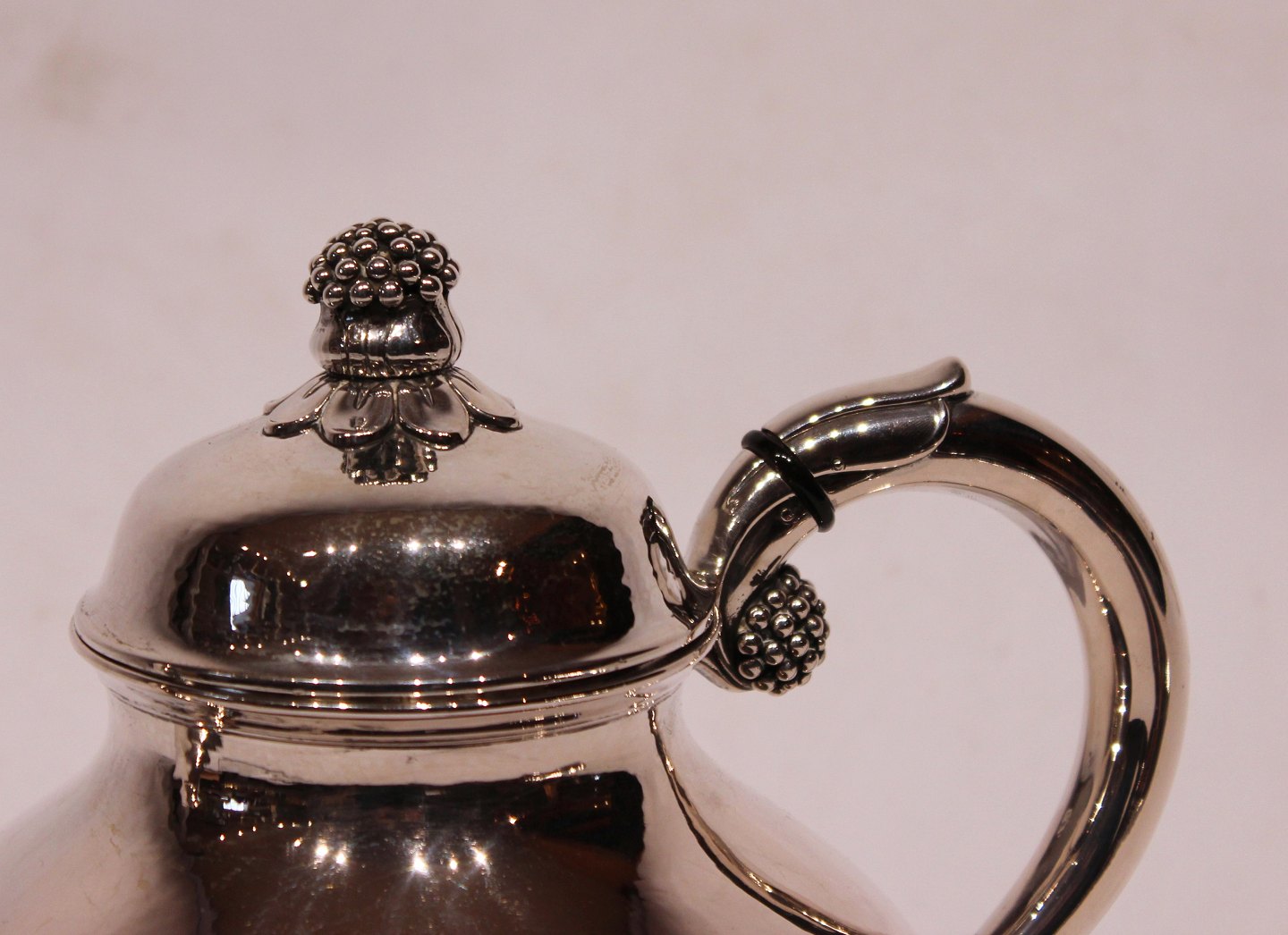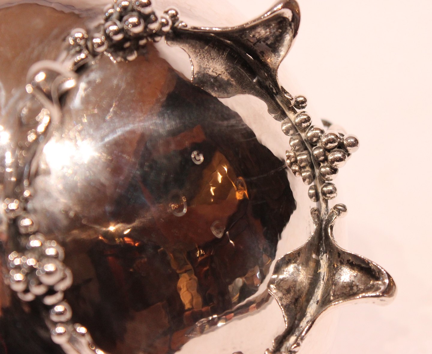 Tea pot of hallmarked silver decorated with grapes and on feet.