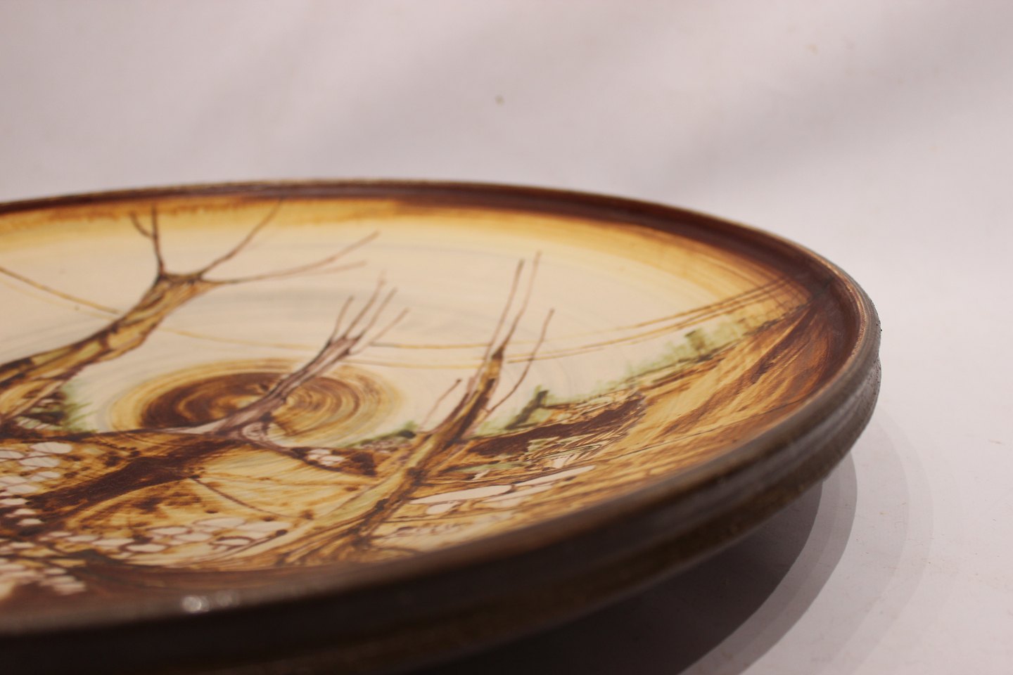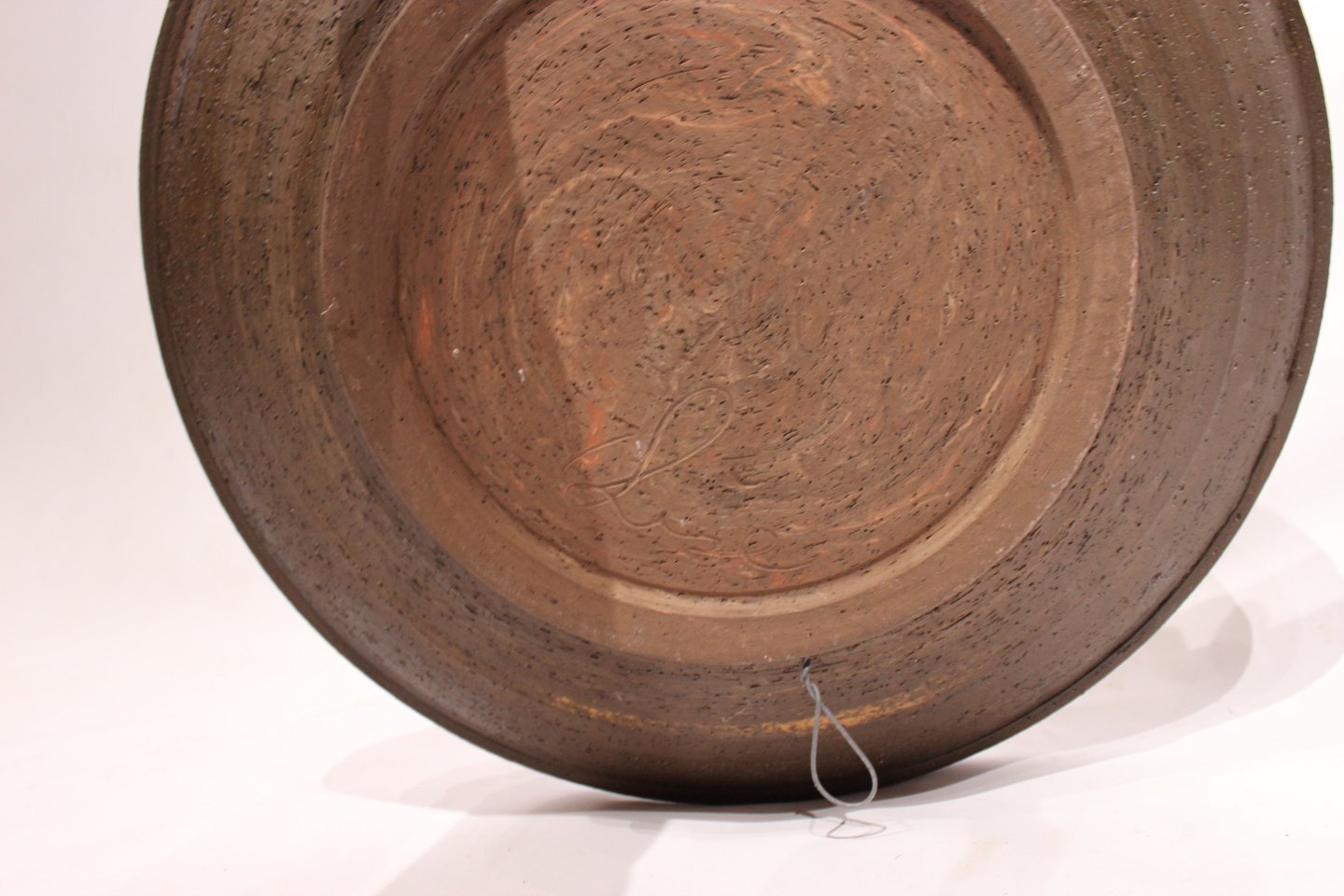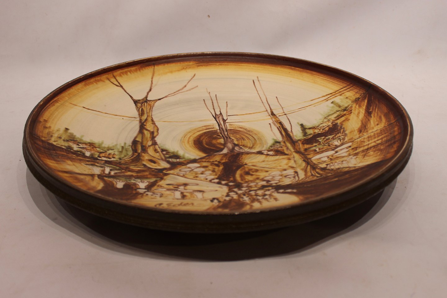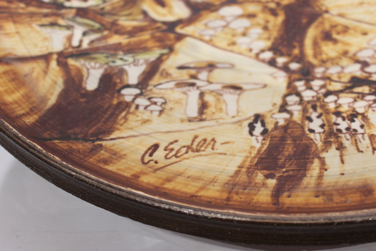 SolgtStort rundt keramik fad i mørke og lyse brune farver signeret C. Eden. Fadet er i flot brugt stand.