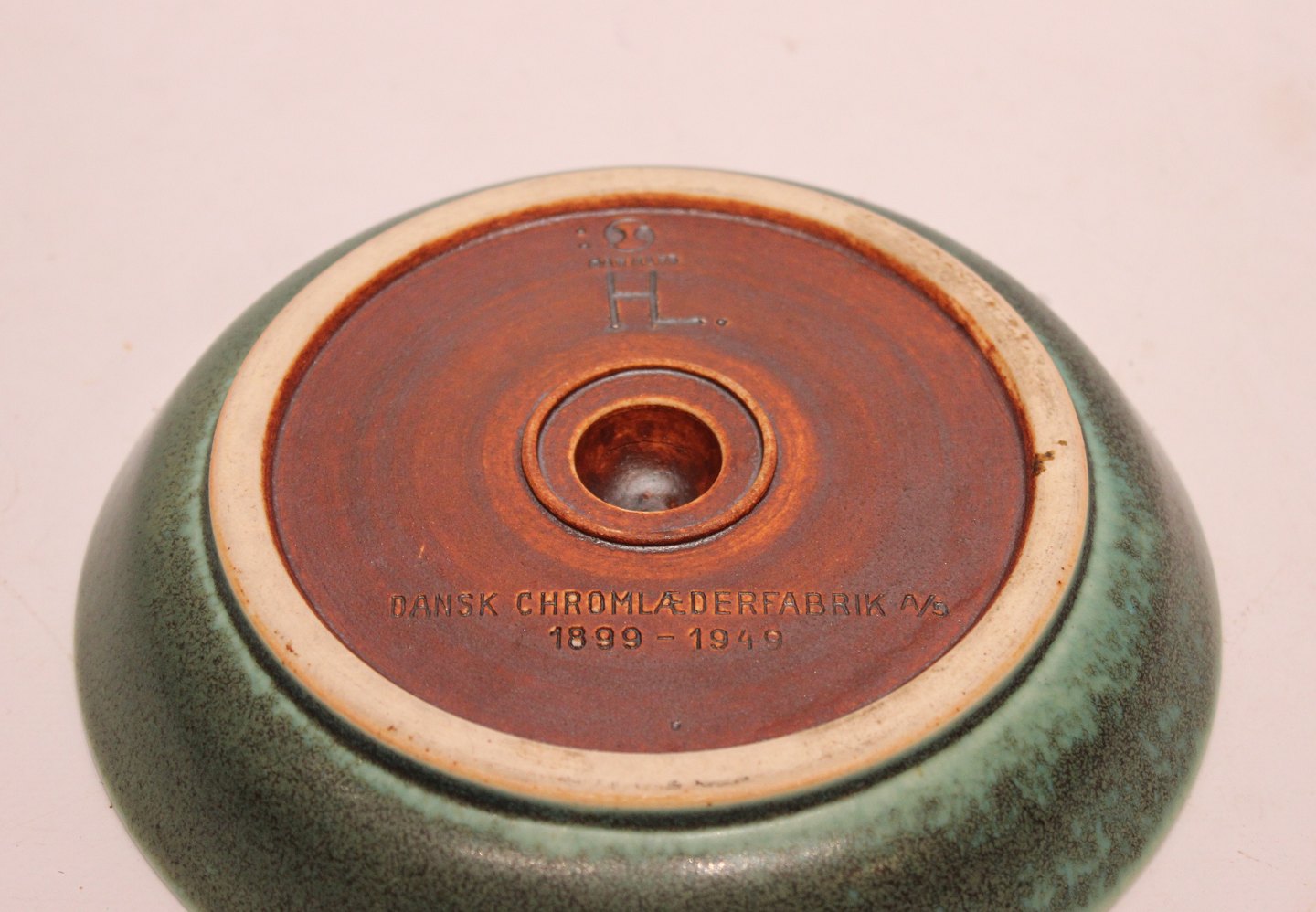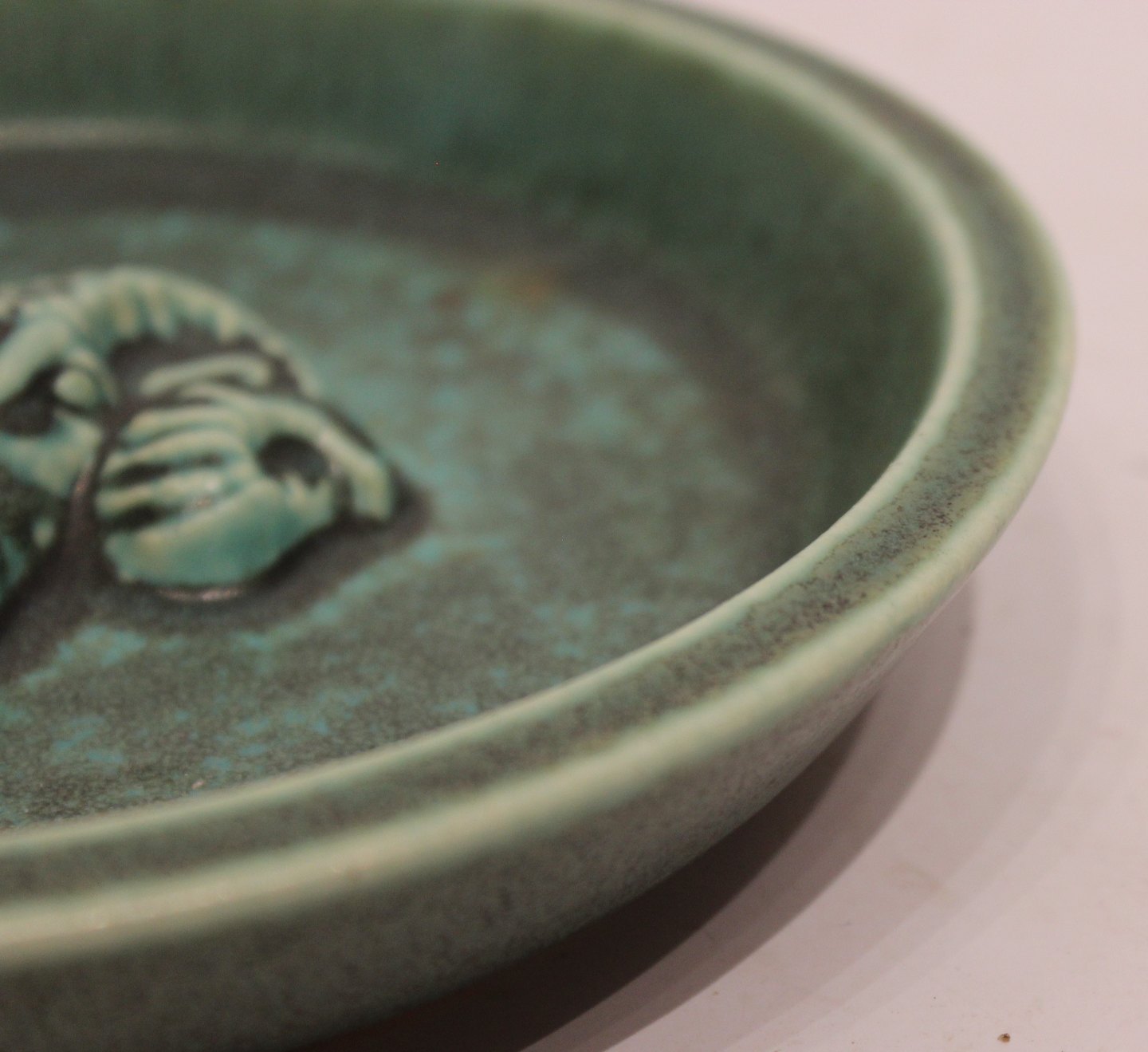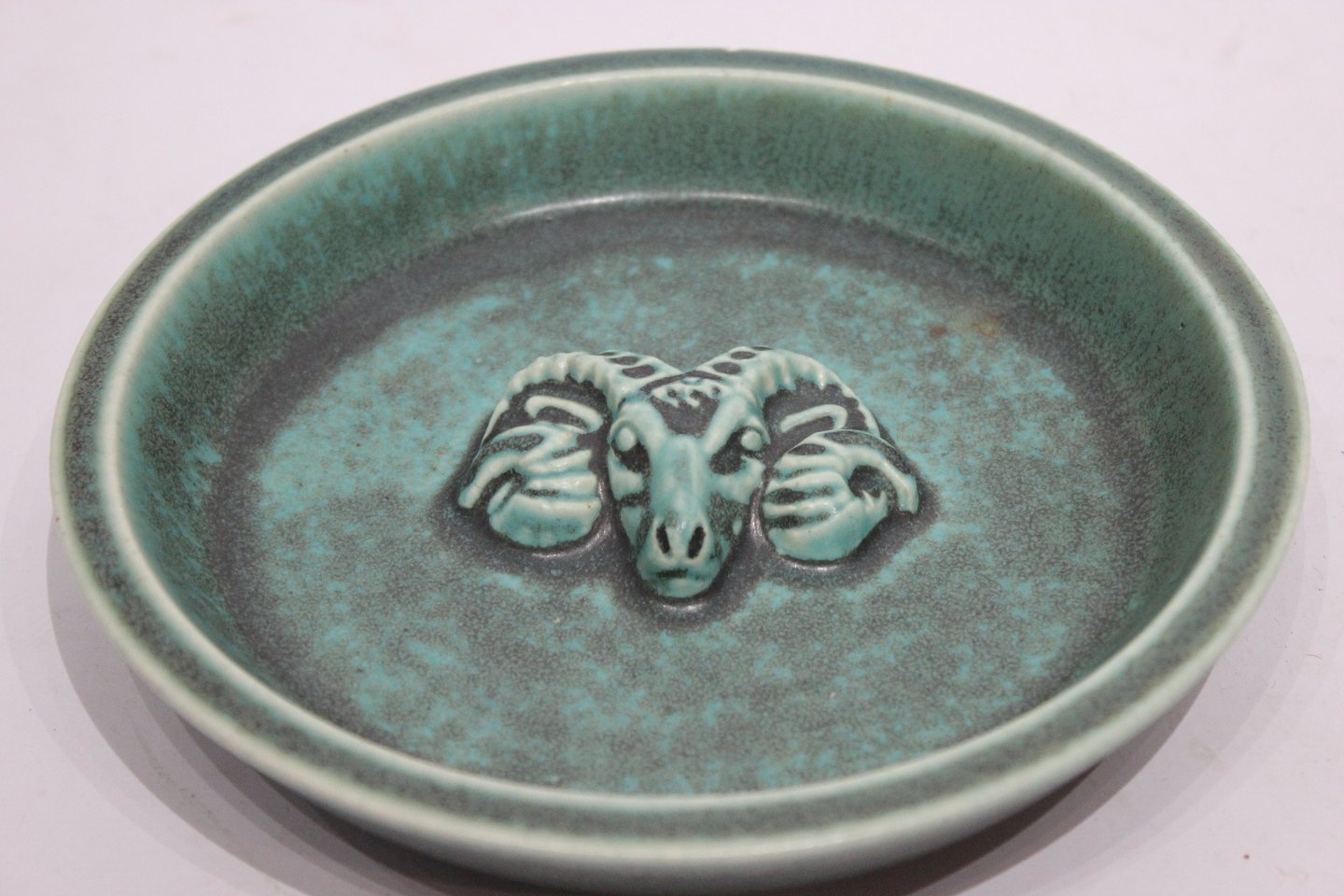 SolgtKeramik fad i grønne og turkise farver med vædder motiv af Hugo Liisberg for Saxbo.