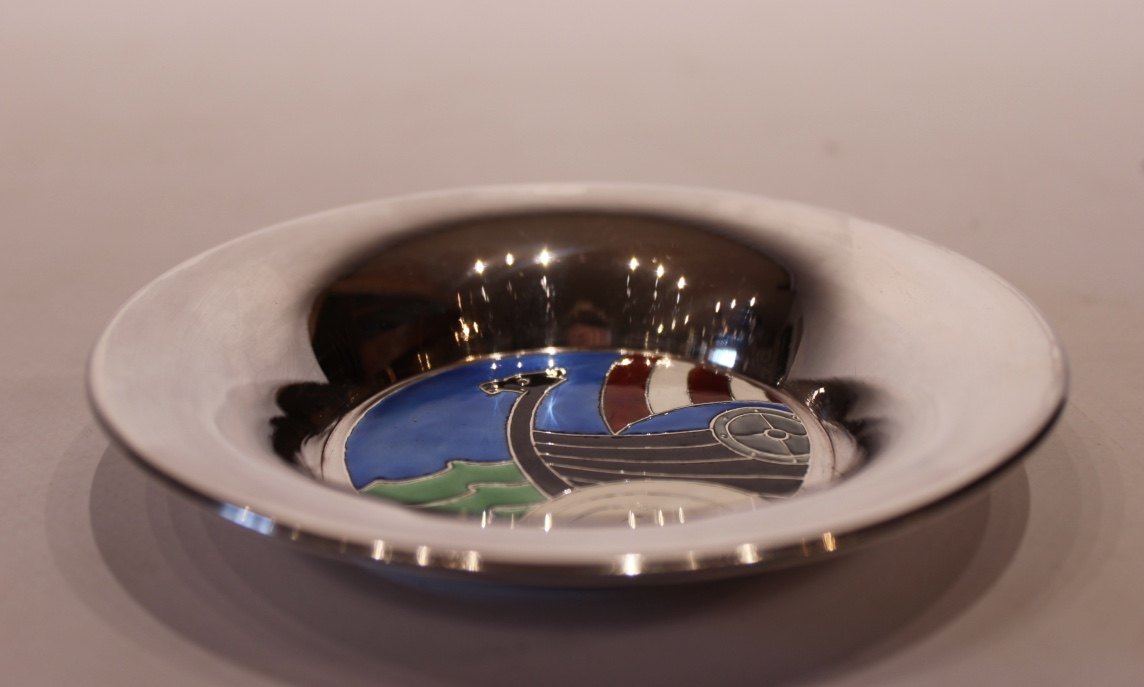 Small plate with enamel in different colors as a viking ship and of hallmarked silver.